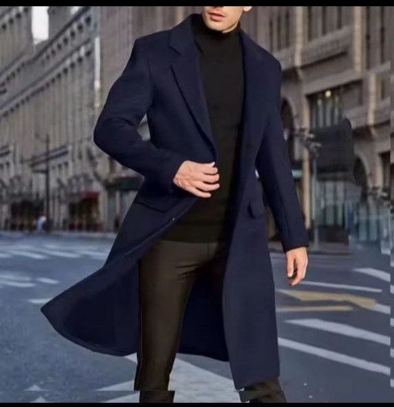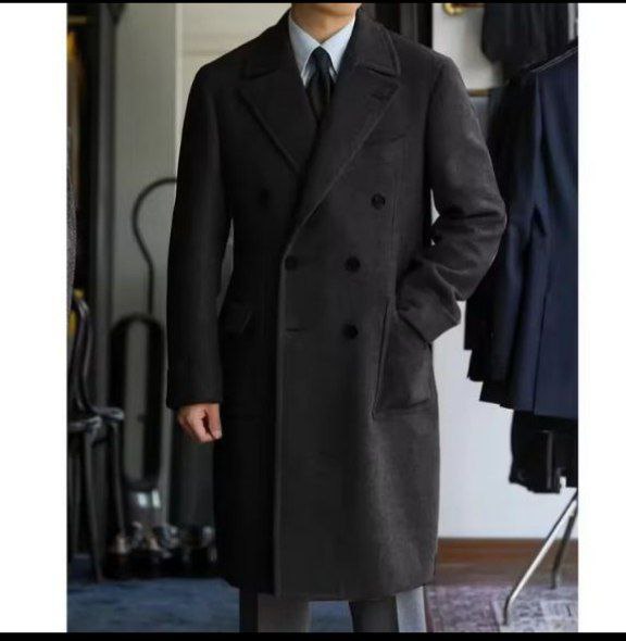 Style: Long coat with peak lapel.
