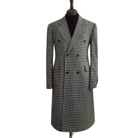 Men’s Houndstooth Long Coat – Casual Wool Overcoat with Peak Lapel
