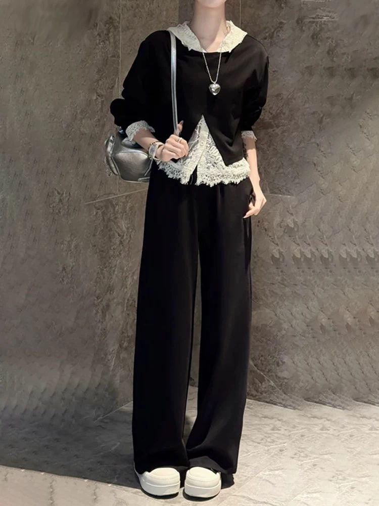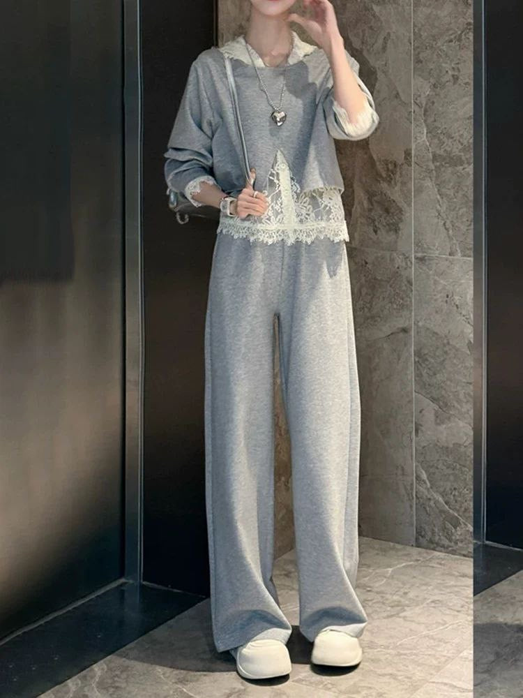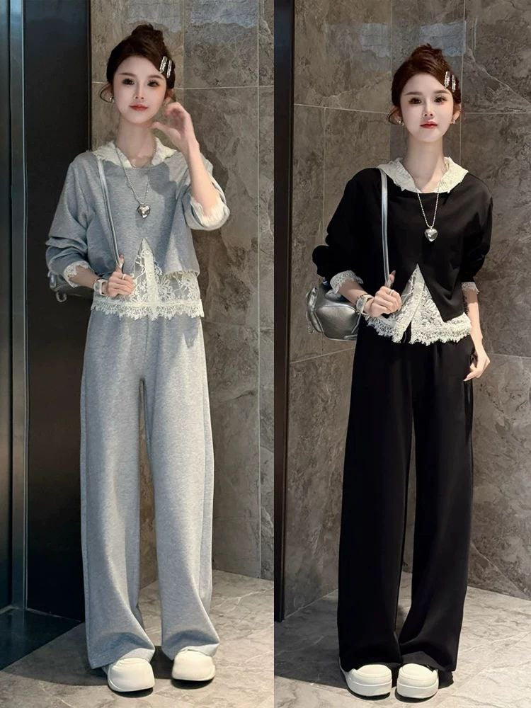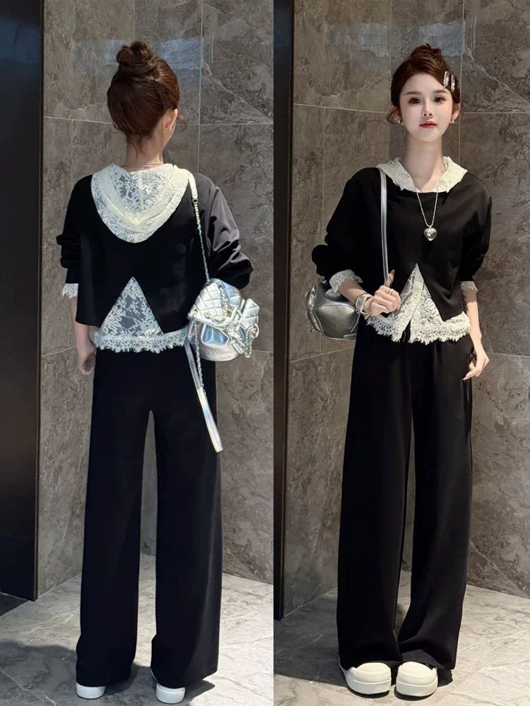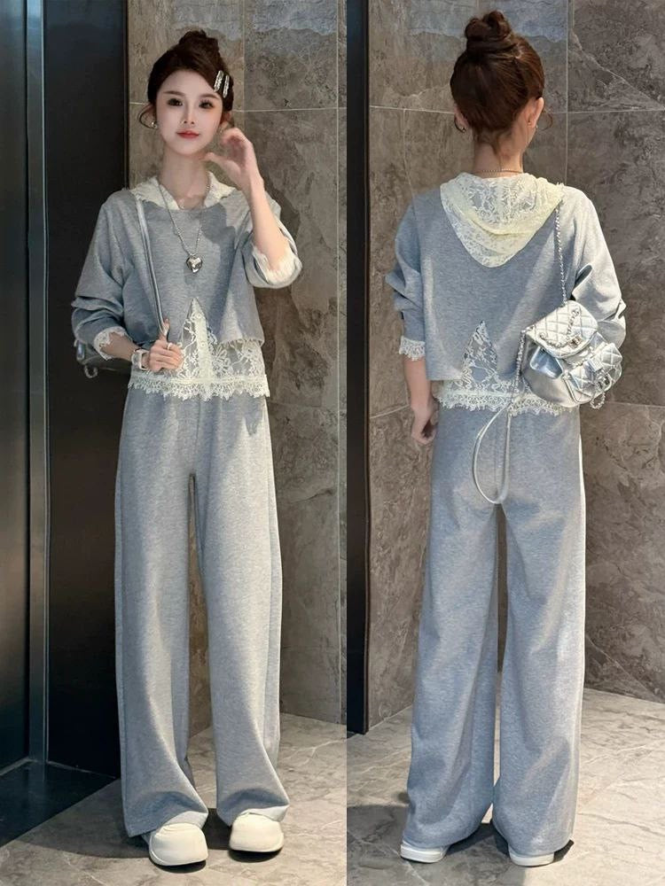 Tmall 2025 Korean-style lace hoodie with back slit and wide-leg pants – designed to reduce aging appearance.