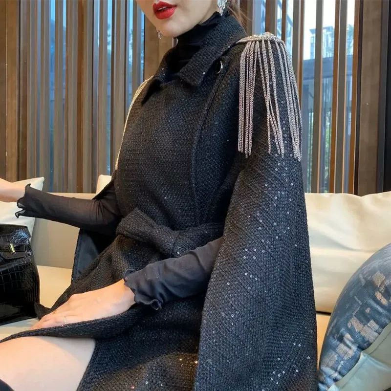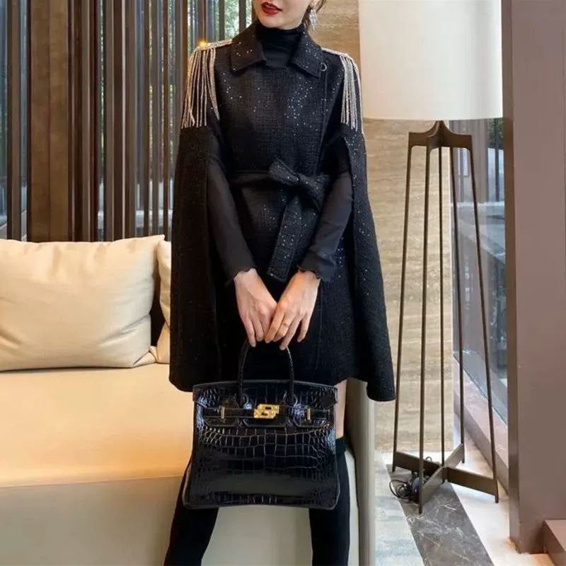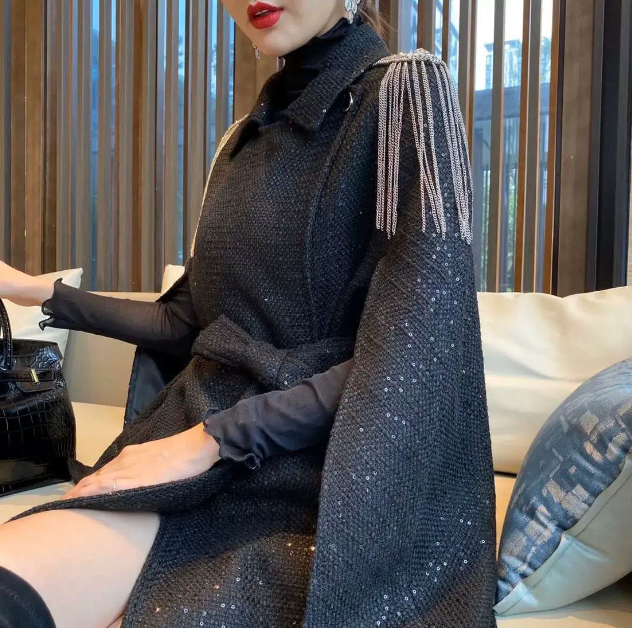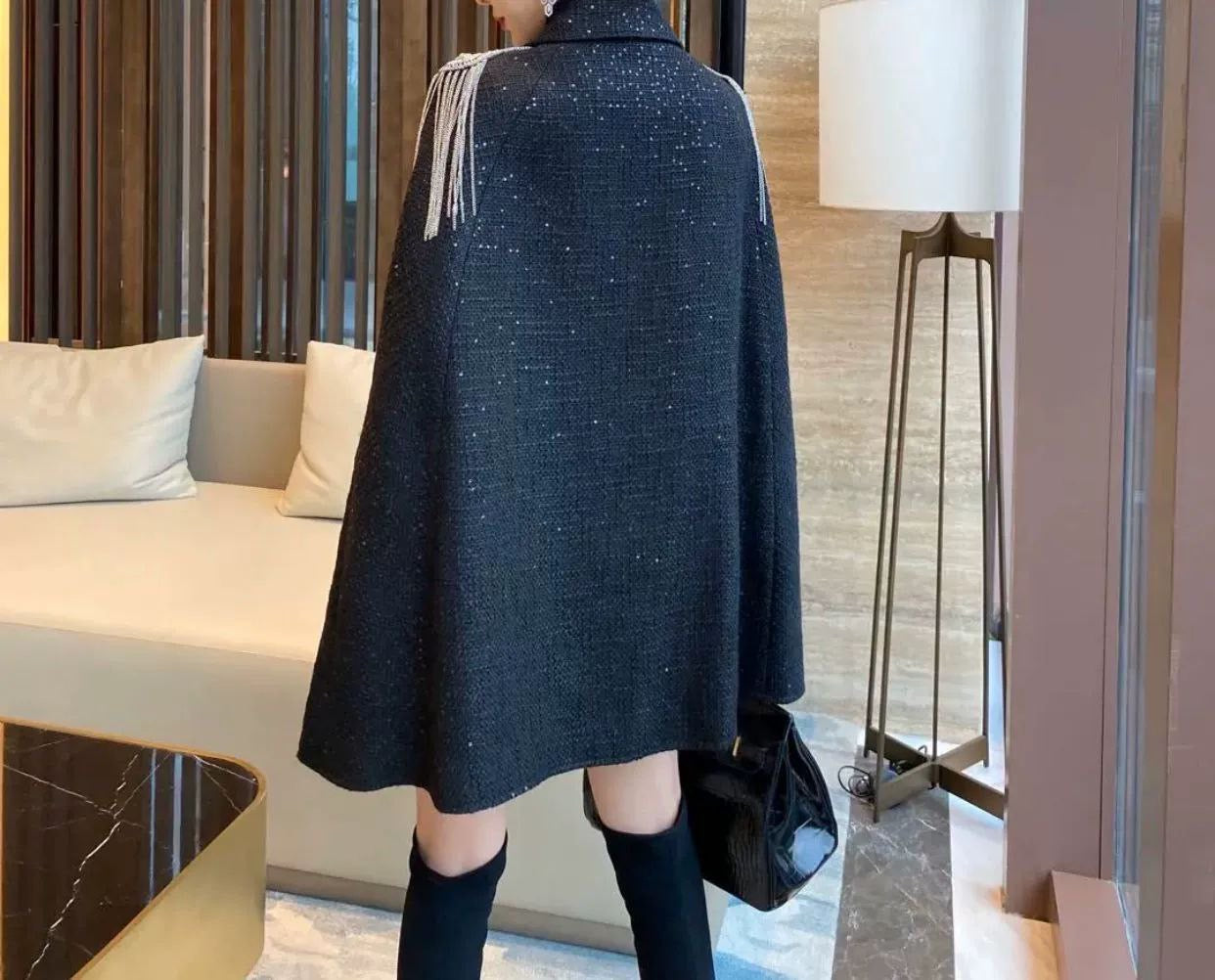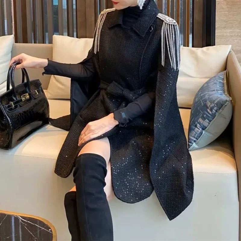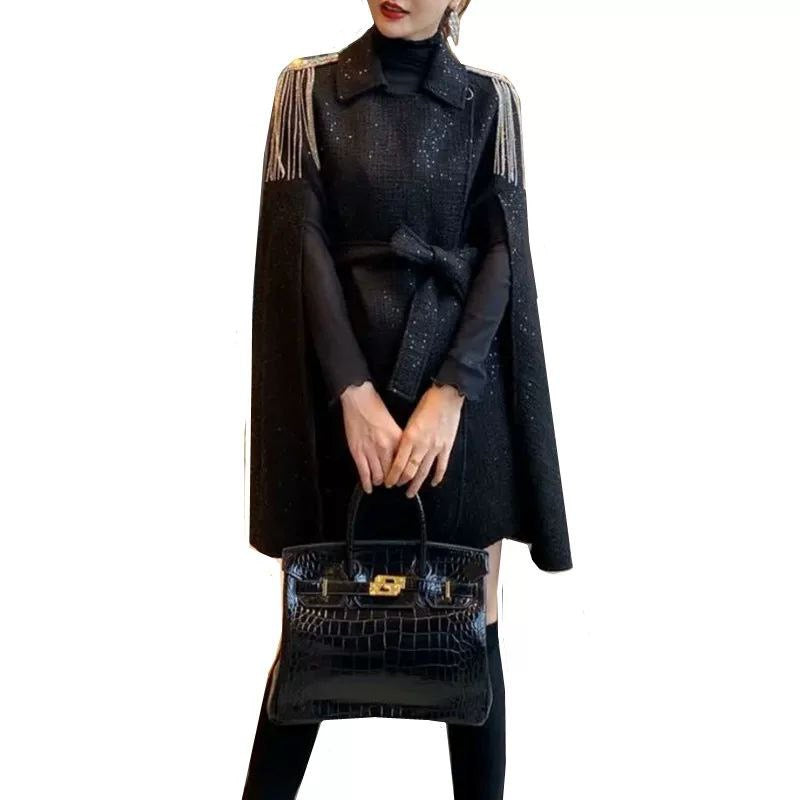 Elegant cape-style coat with slim belt and celebrity-inspired shoulder shawl. A refined look for the autumn season.