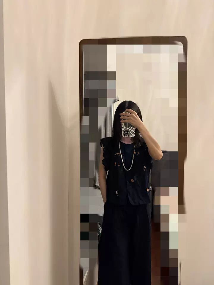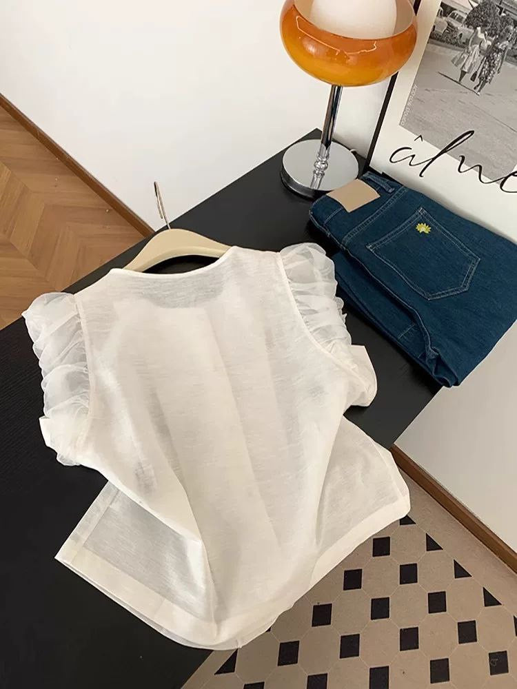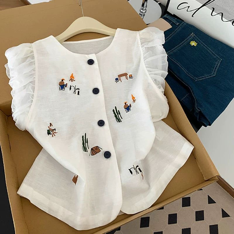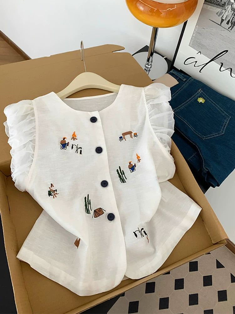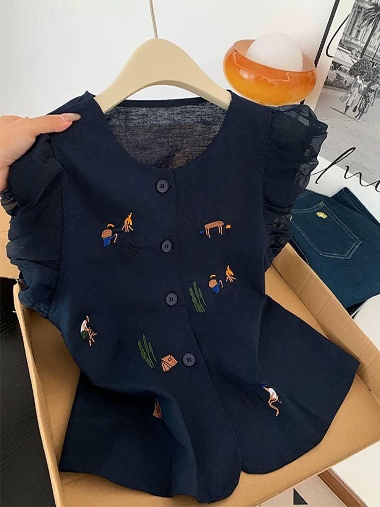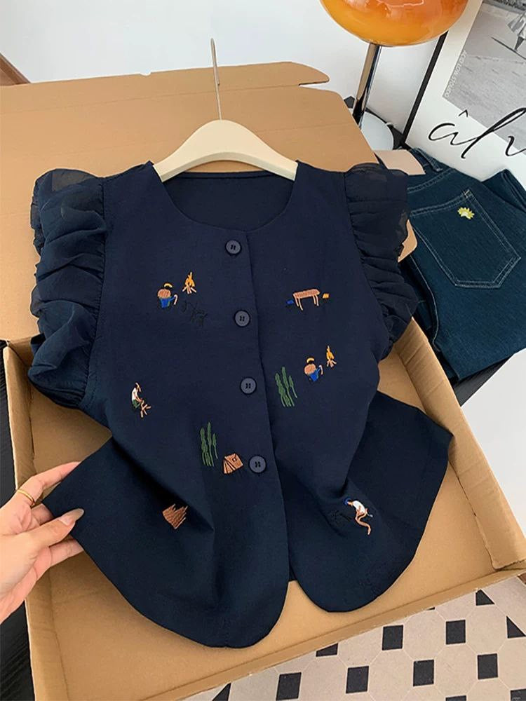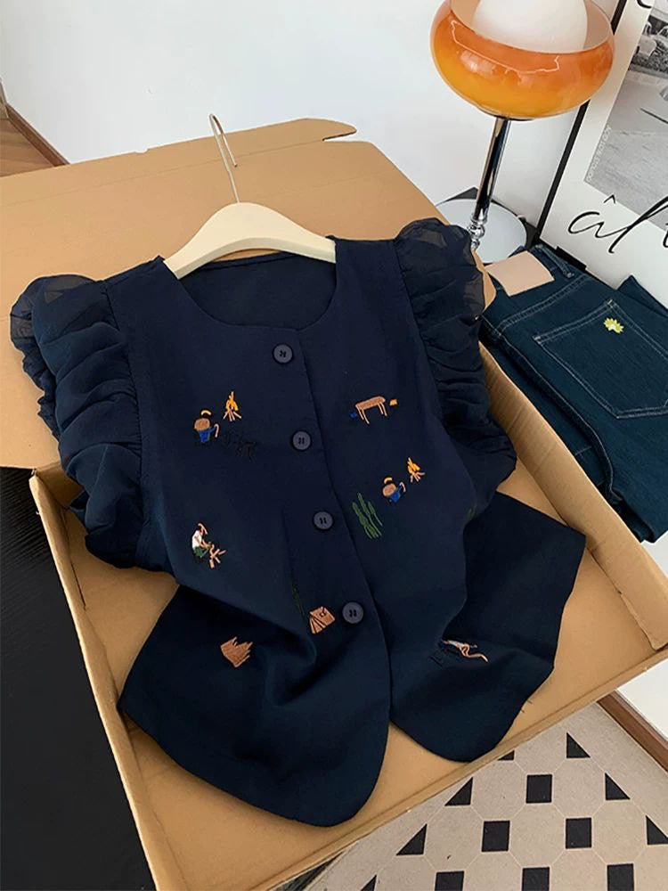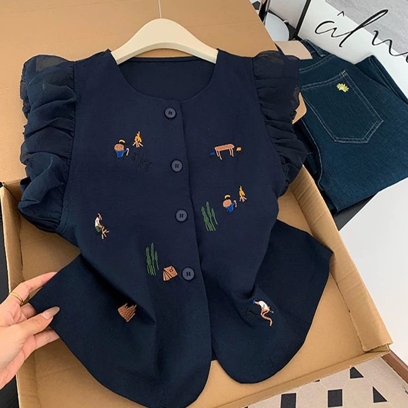 Short sleeves, niche design, dark blue with high-quality cartoon embroidery, blouse with flower bud sleeves