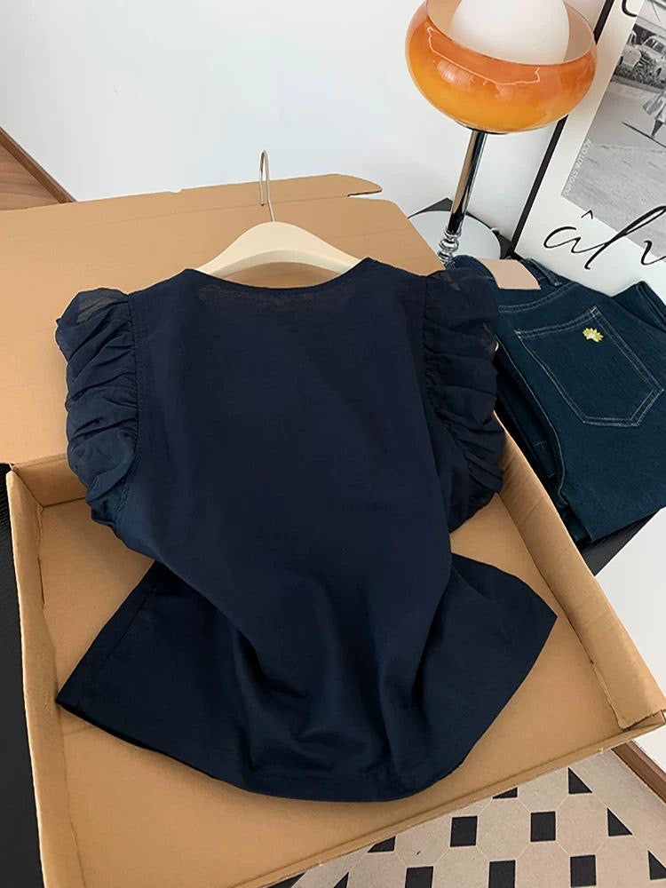 Kurze Ärmel, Nischen-Design, Dunkelblau mit hochwertiger Cartoon-Stickerei, Bluse mit Blütenknospen-Ärmeln