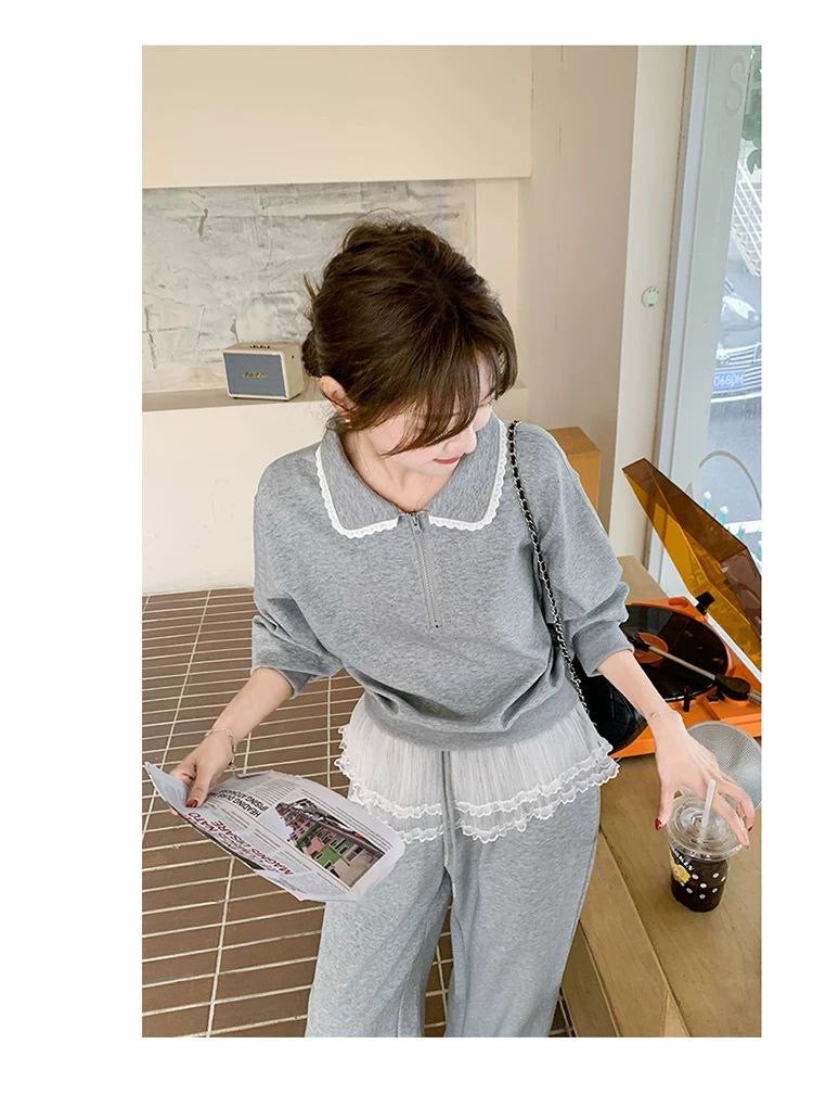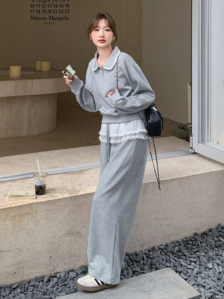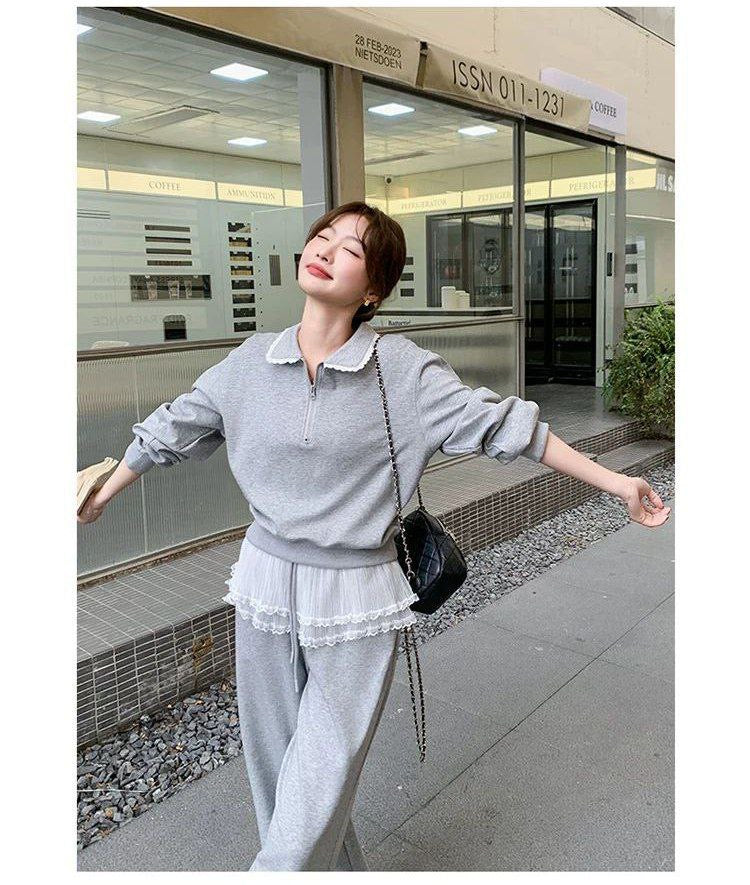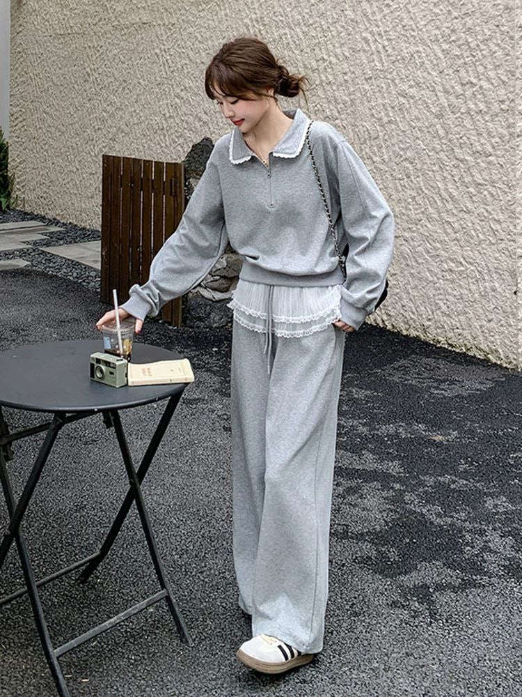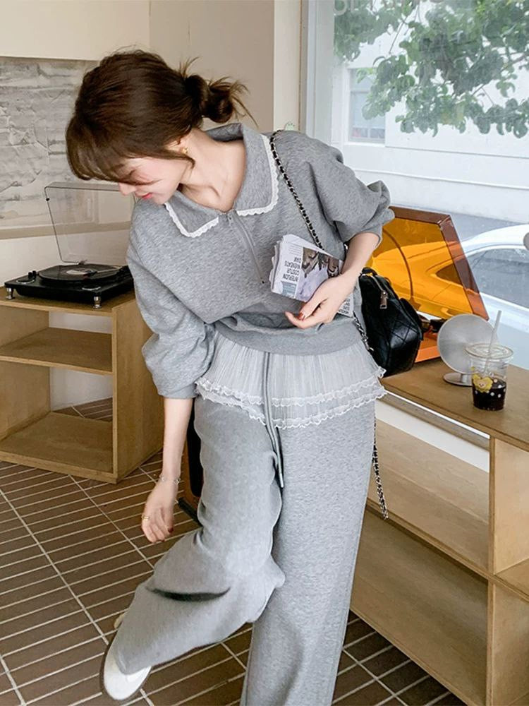 بدلة نسائية من قطعتين بنمط سويت شيرت فضفاض مع دانتيل وبنطلون واسع الساق بخصم على موضة ربيع