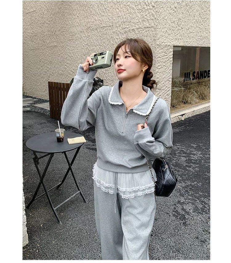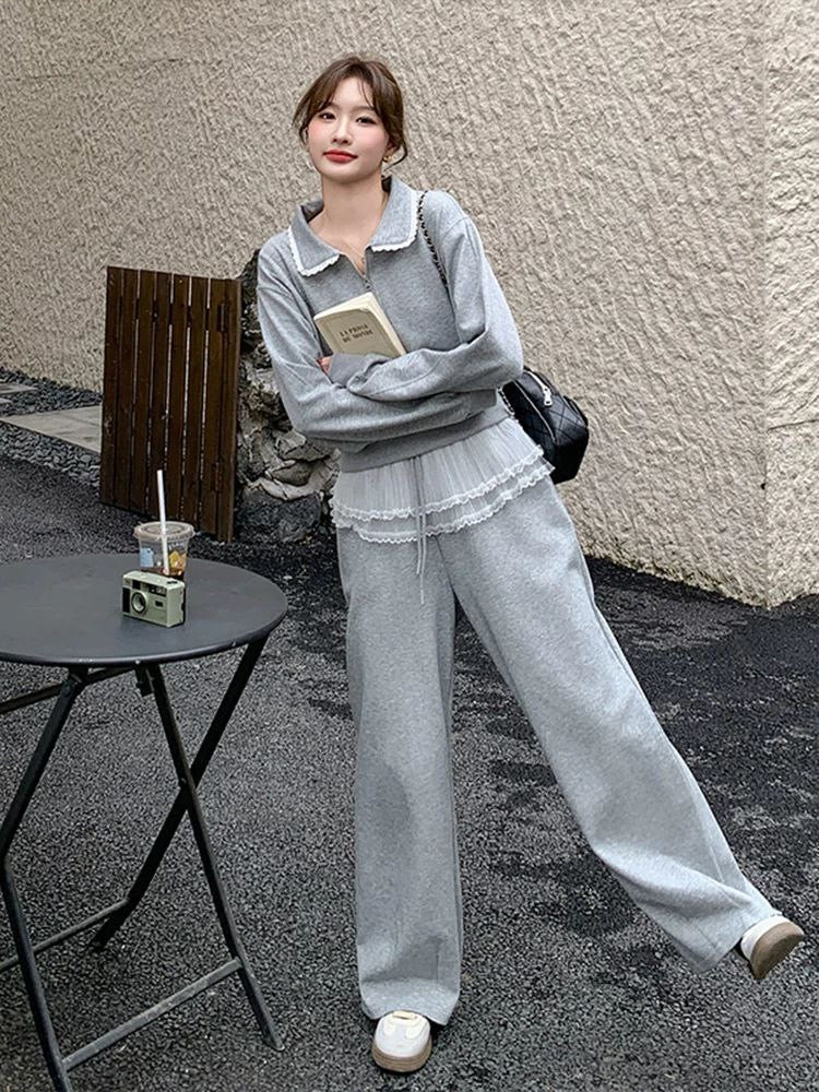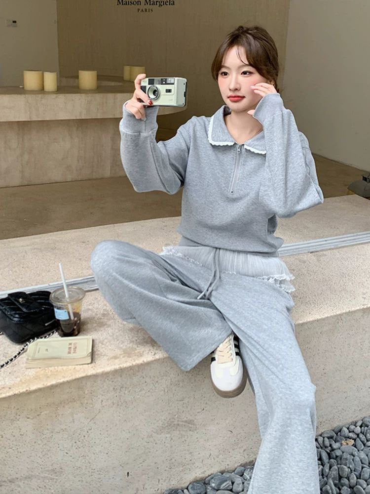 Trendy Spring Set: Loose sweatshirt-style top with lace and wide-leg pants – modern casual style with elegance