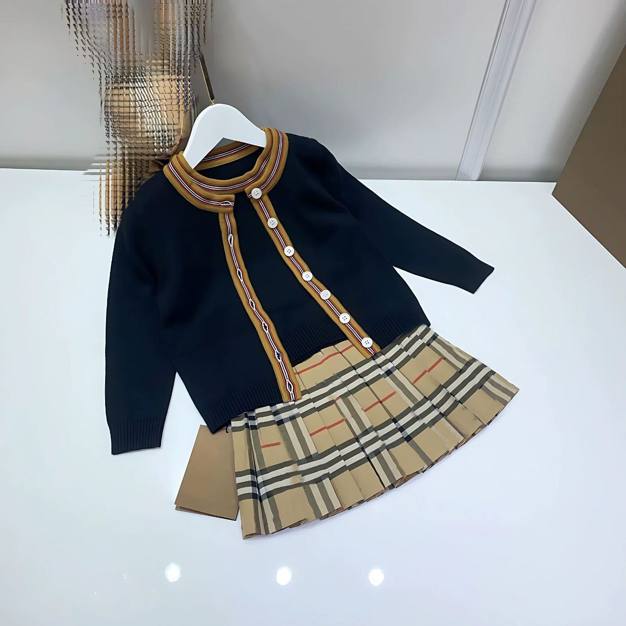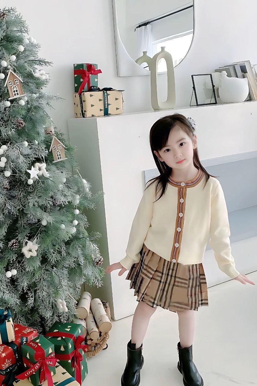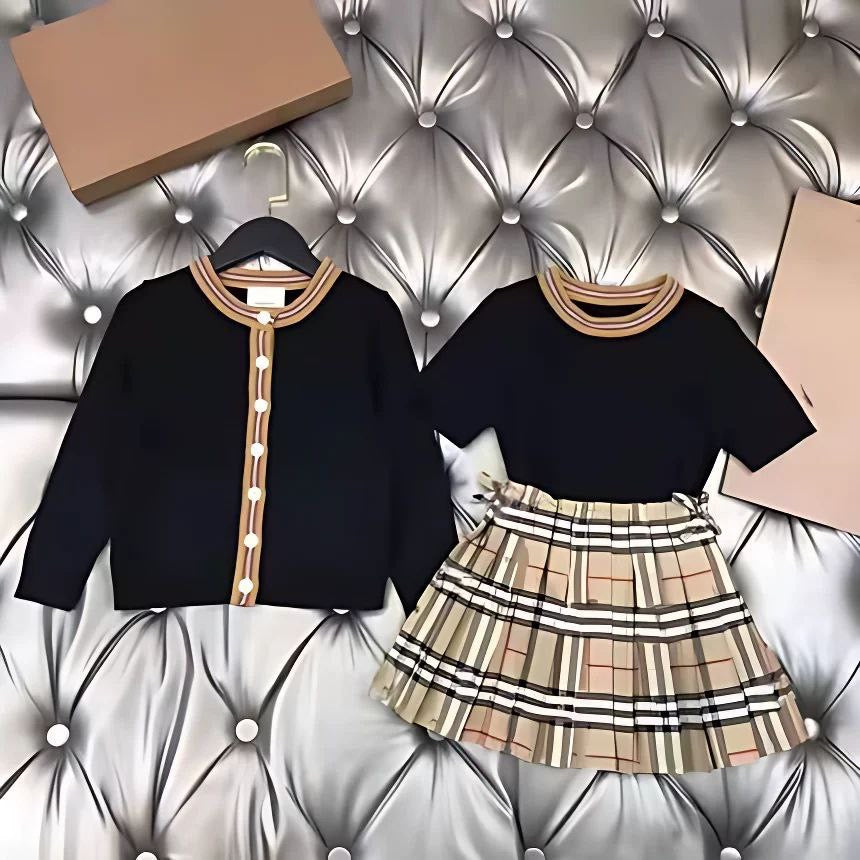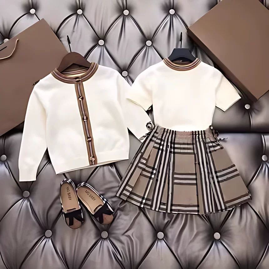Chanel-Inspired Girls’ 3-Piece Set – Short Sleeve Top, Knit Cardigan & Pleated Skirt
