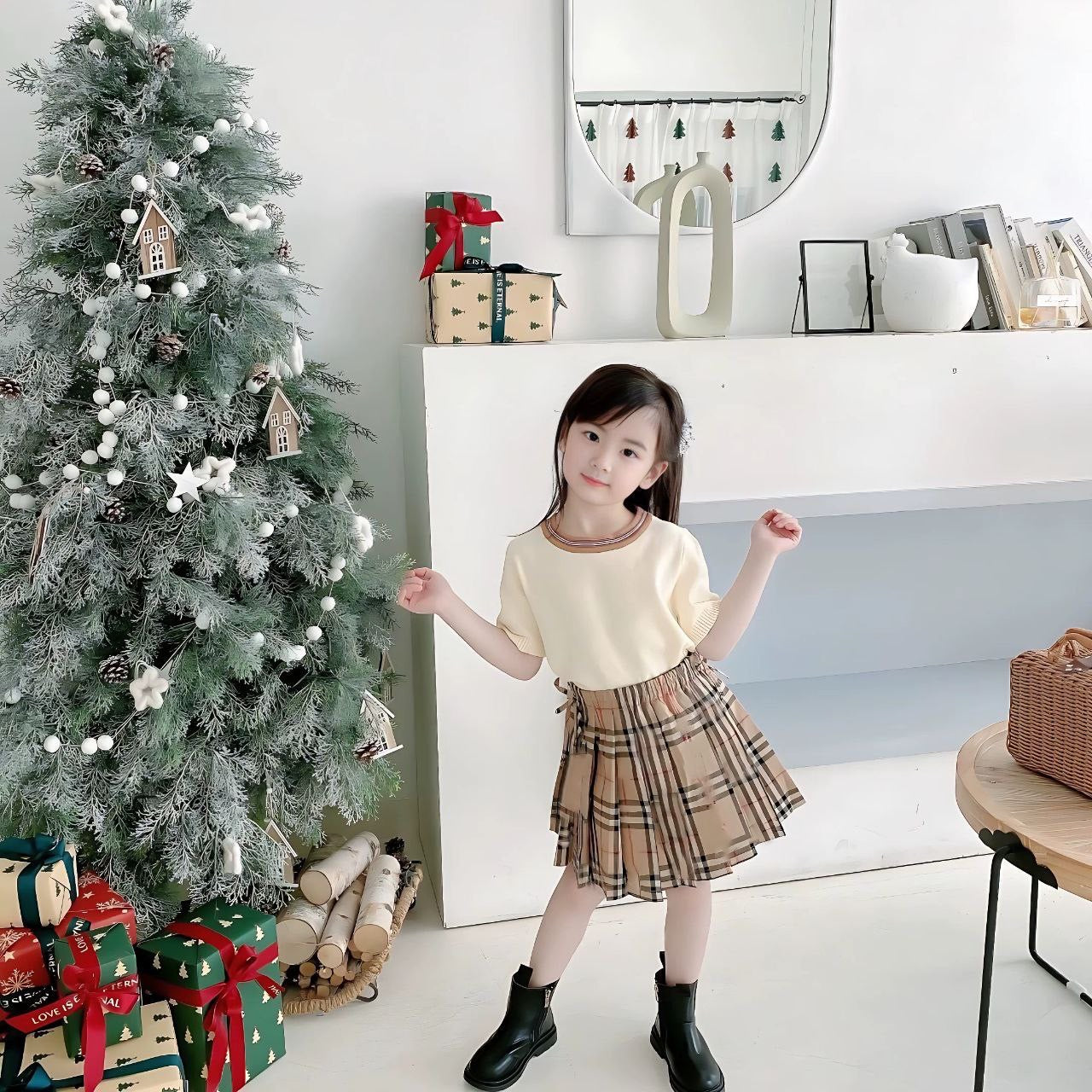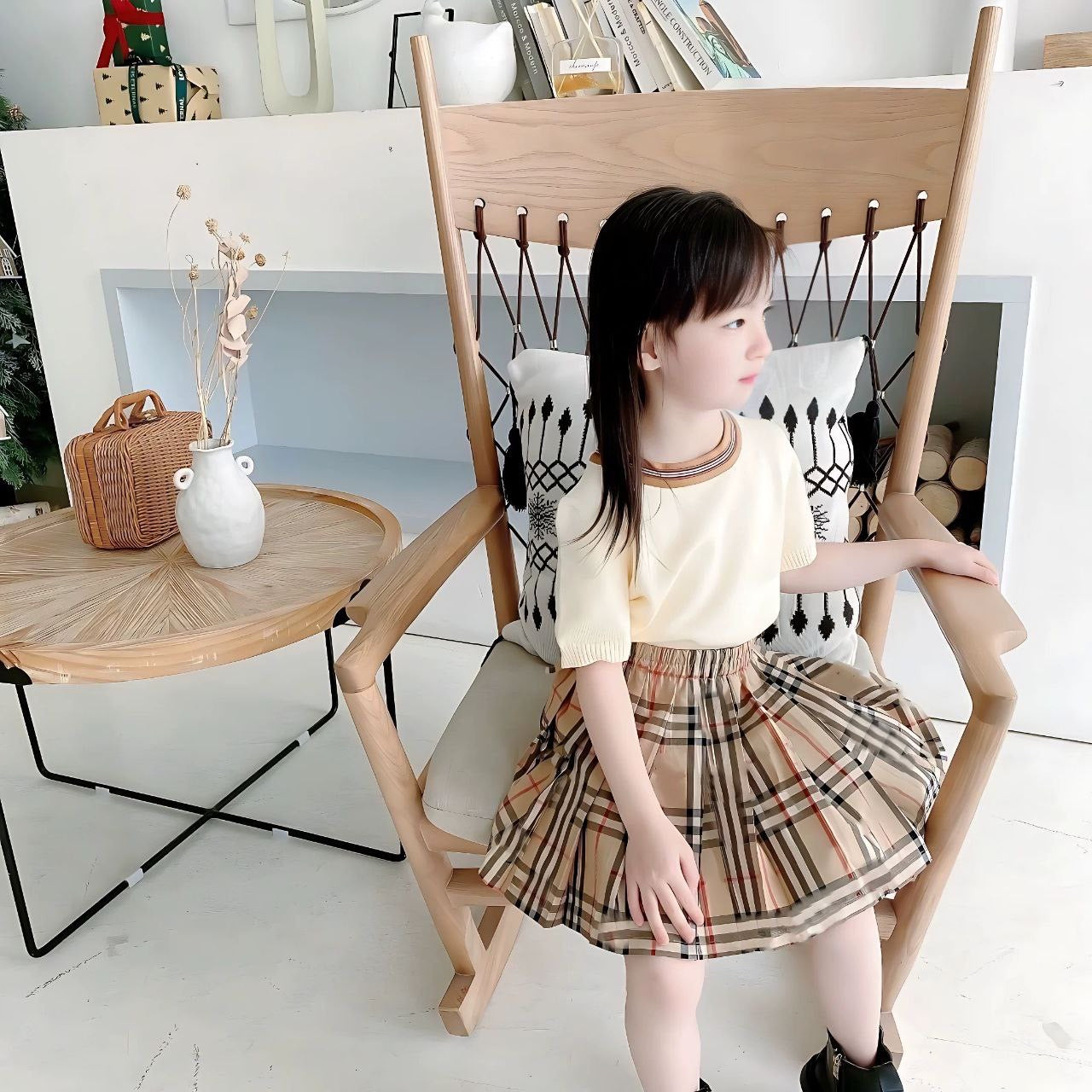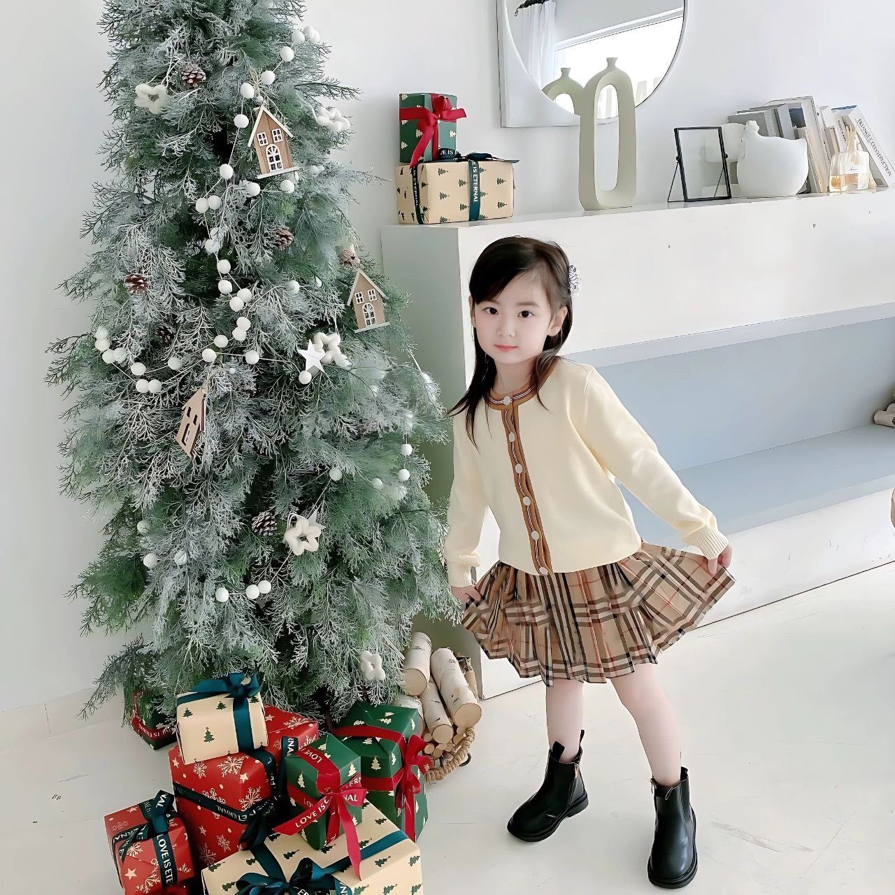 Chanel-Inspired Girls’ 3-Piece Set – Short Sleeve Top, Knit Cardigan & Pleated Skirt