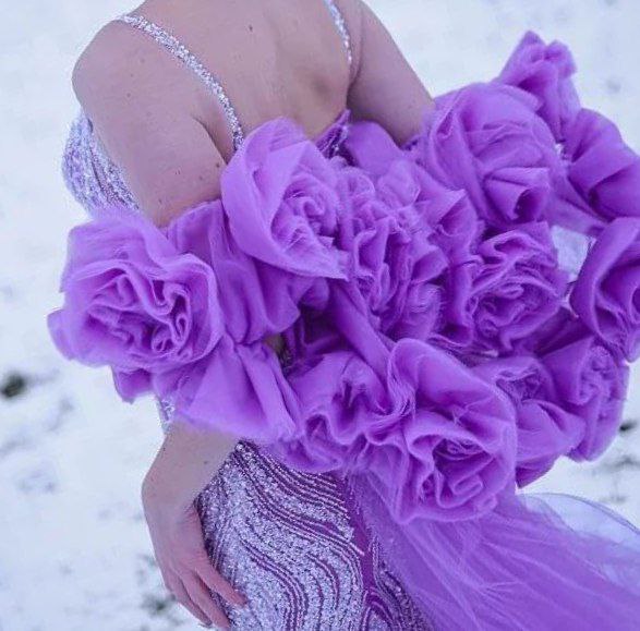 This luxurious evening gown is custom-made in a stunning purple shade, featuring intricate bead embroidery throughout. Its elegant long silhouette is designed to shine at high-profile occasions such as red carpet events, award ceremonies, and gala evenings.