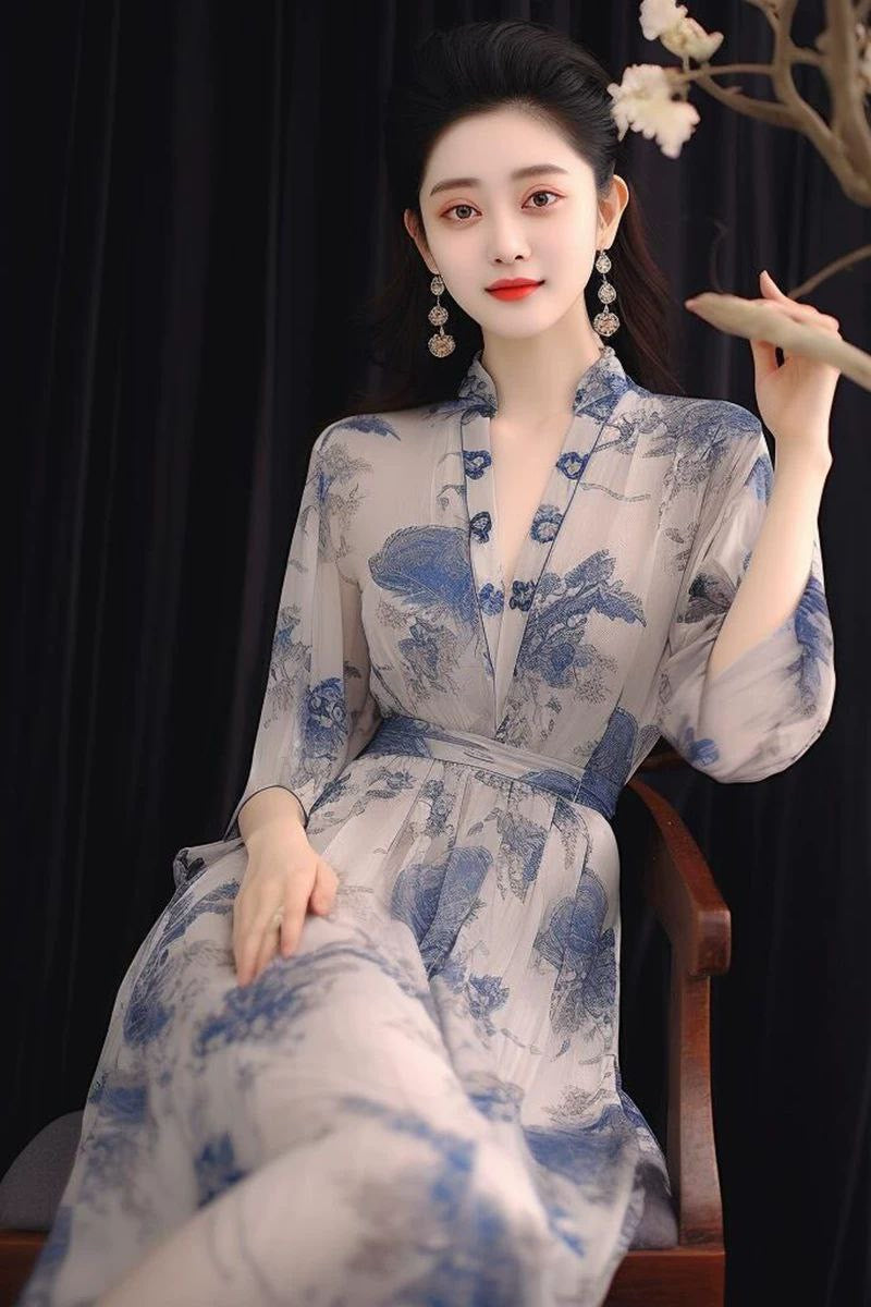 فستان راقٍ من الشيفون من ماركات عالمية، بتصميم أنثوي مميز، وقصة V جذابة تعكس الأناقة والأنوثة، مثالي للمناسبات الخاصة.