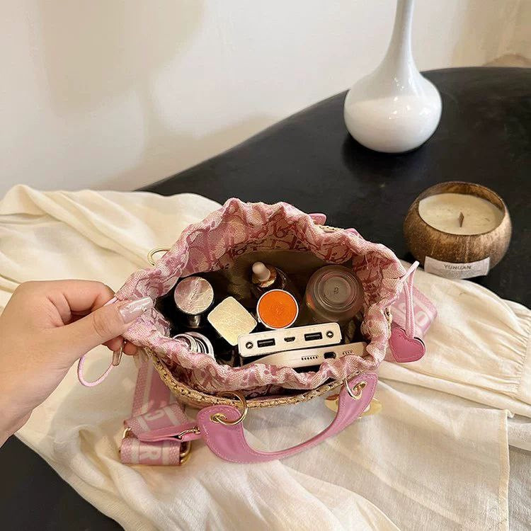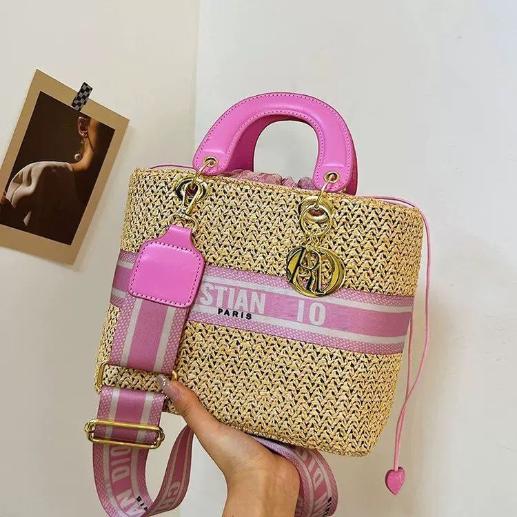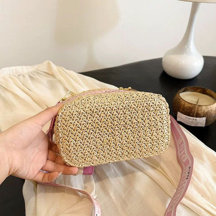 Summer fashion beach bag with small grass texture and wide braided shoulder strap