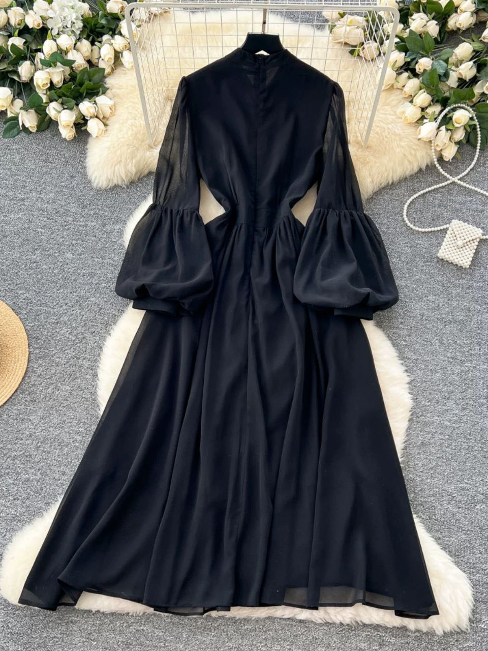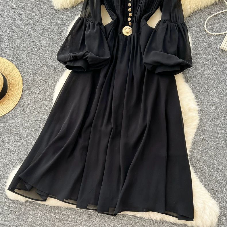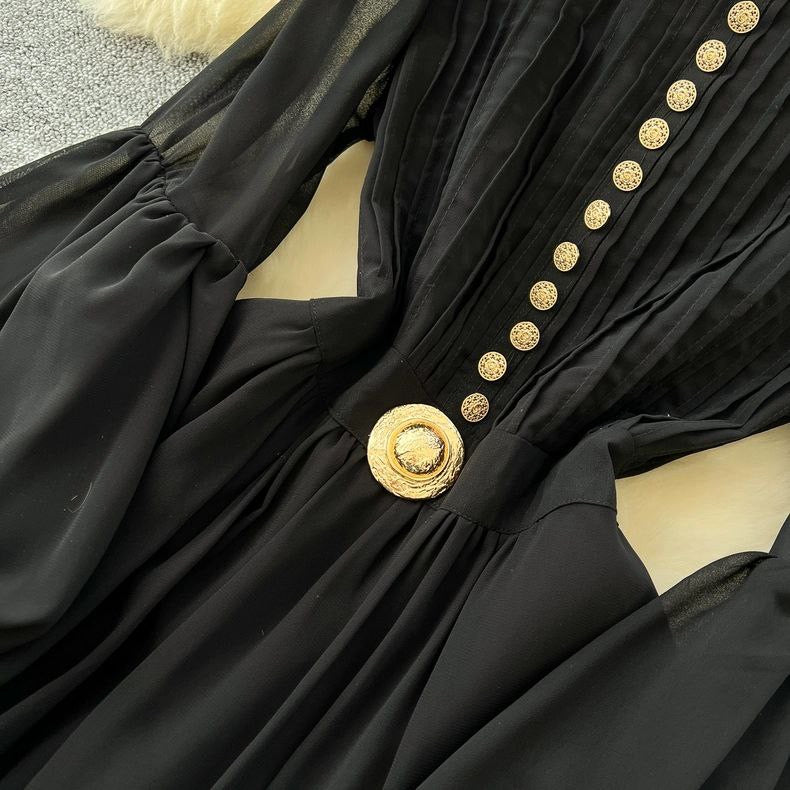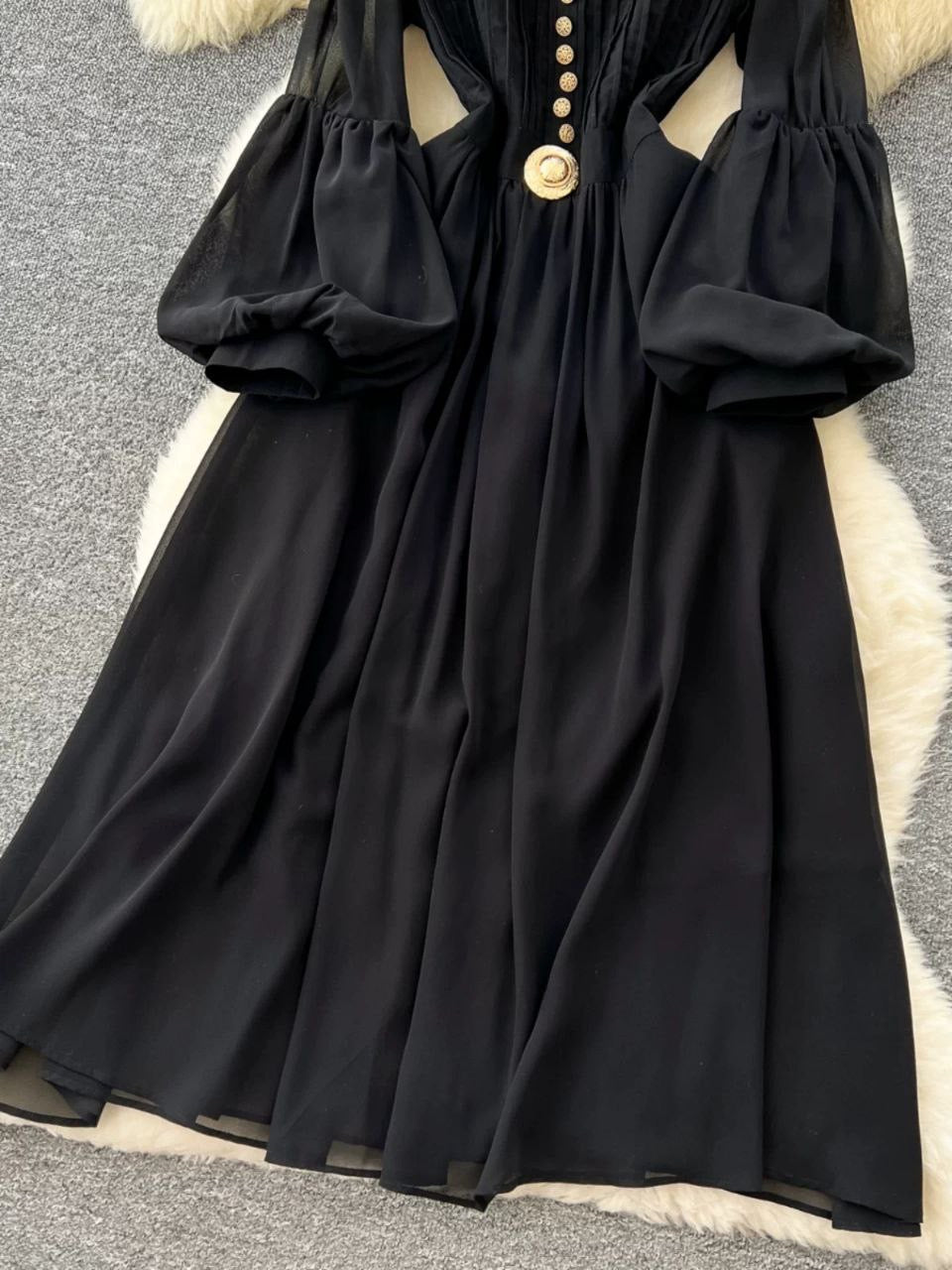 Elegant French-Style Chiffon Dress with Lantern Sleeves and Metal Buckle