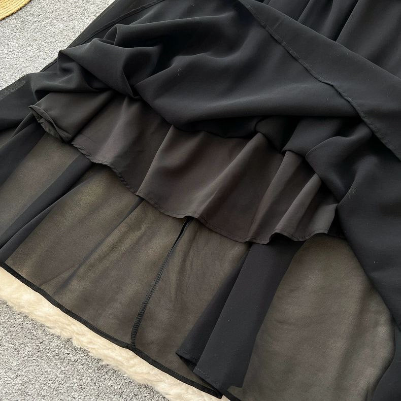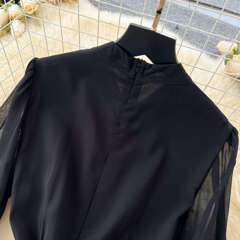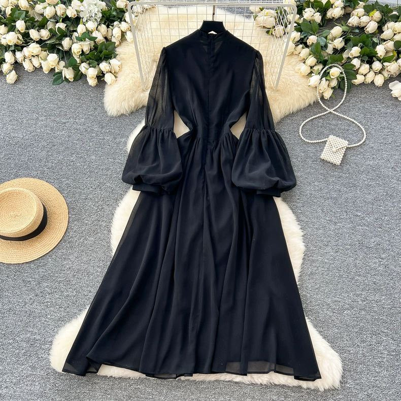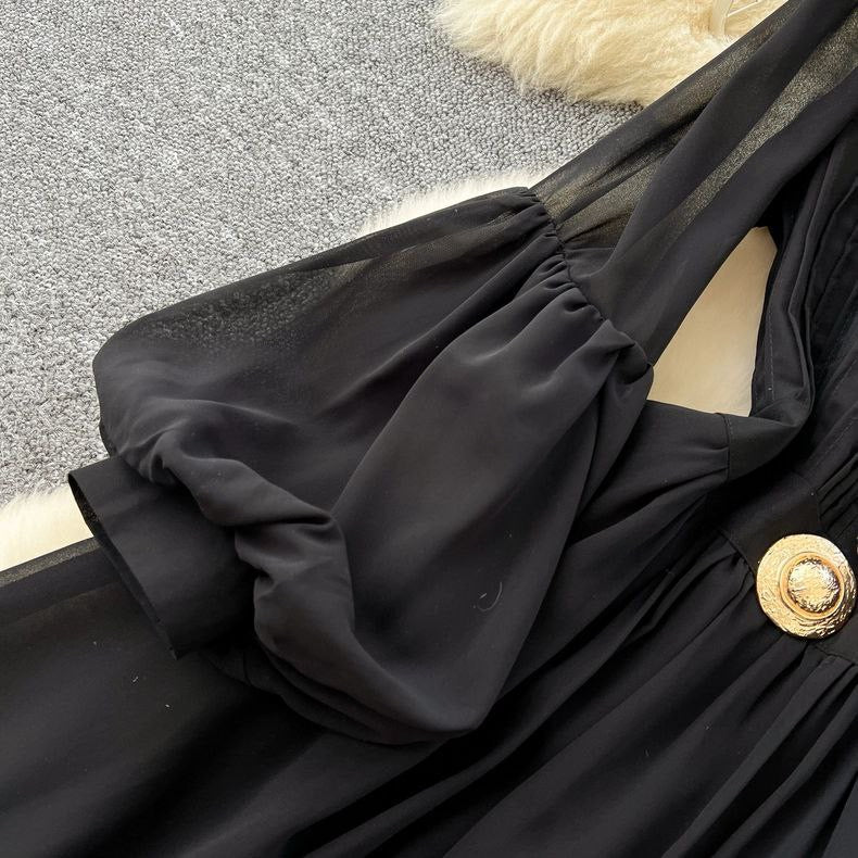 Elegant French-Style Chiffon Dress with Lantern Sleeves and Metal Buckle
