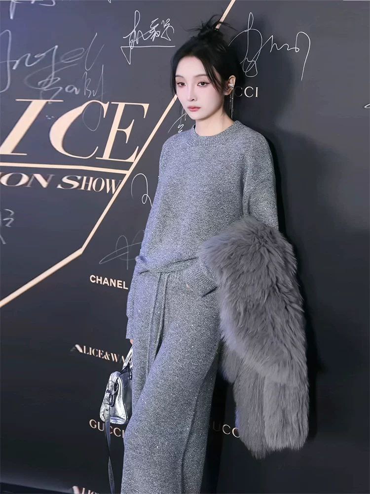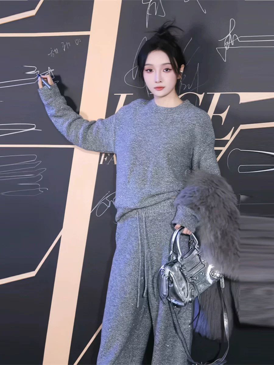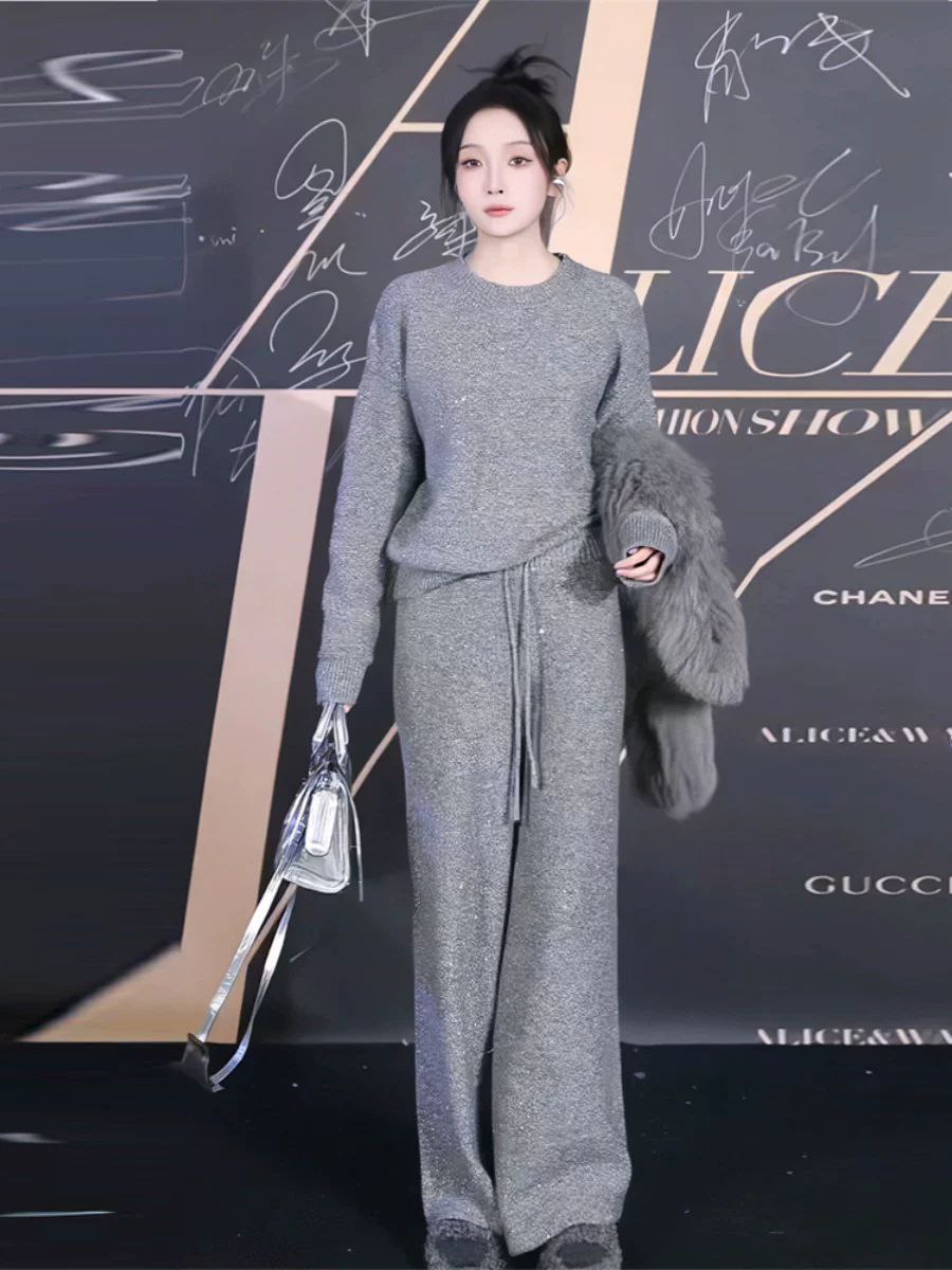 Elegant Knitted Pantsuit – Grey Two-Piece Set for Women