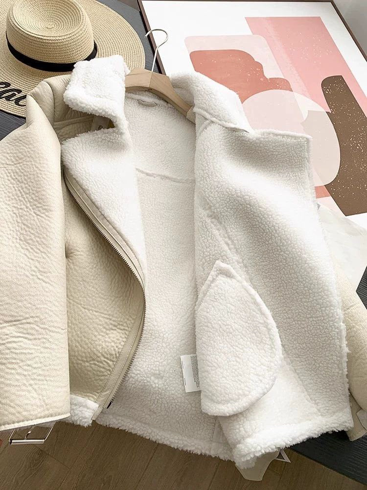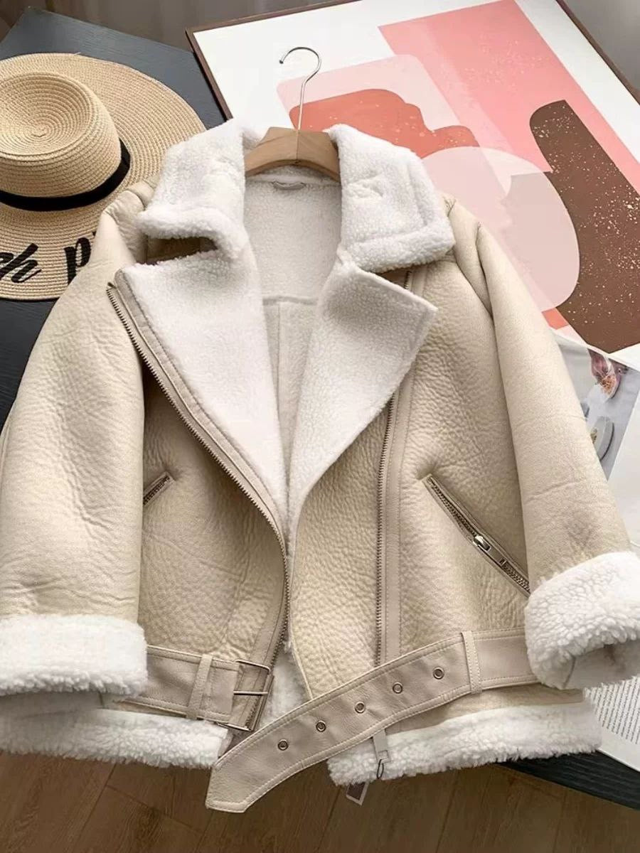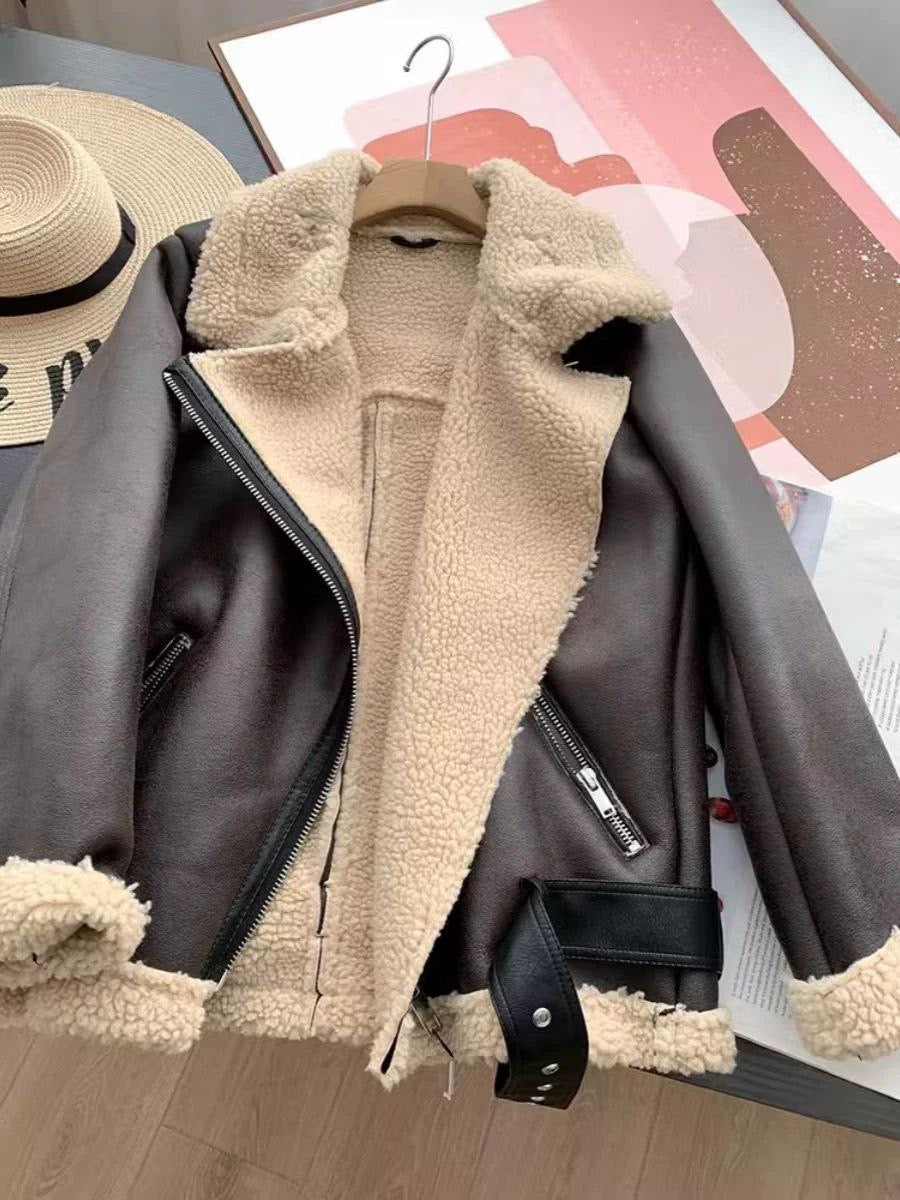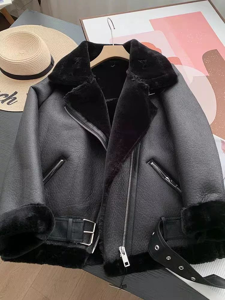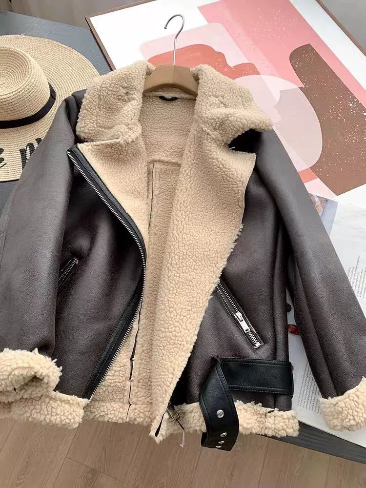 New one-piece coat made of thick lamb wool with an additional velvet biker-style jacket