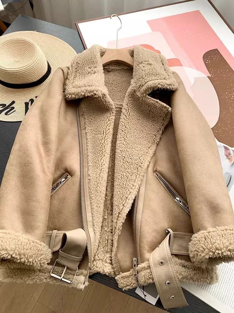 معطف جديد من قطعة واحدة من صوف الحمل السميك، بالإضافة إلى معطف مخملي بتصميم دراجات نارية