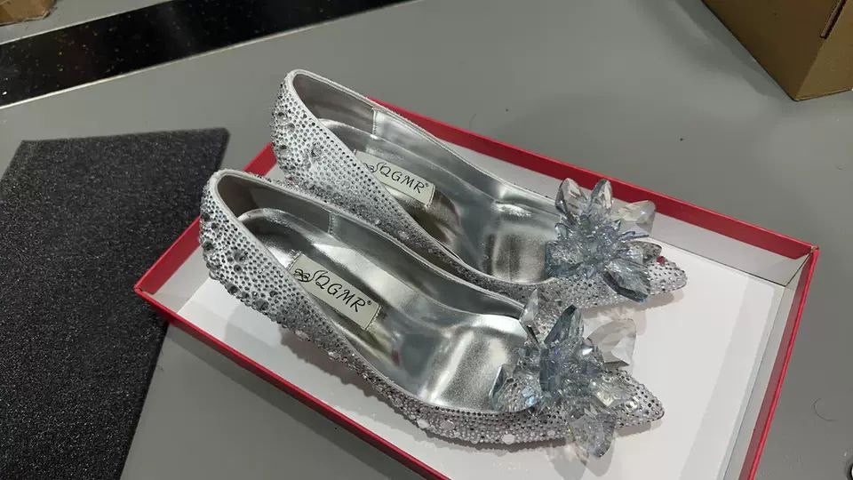 الكعب: عالٍ ومدبب – الزينة: أحجار الراين والكريستال – الاستخدام: حفلات الزفاف والمناسبات الخاصة