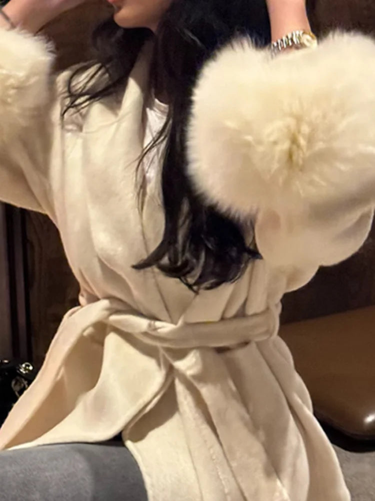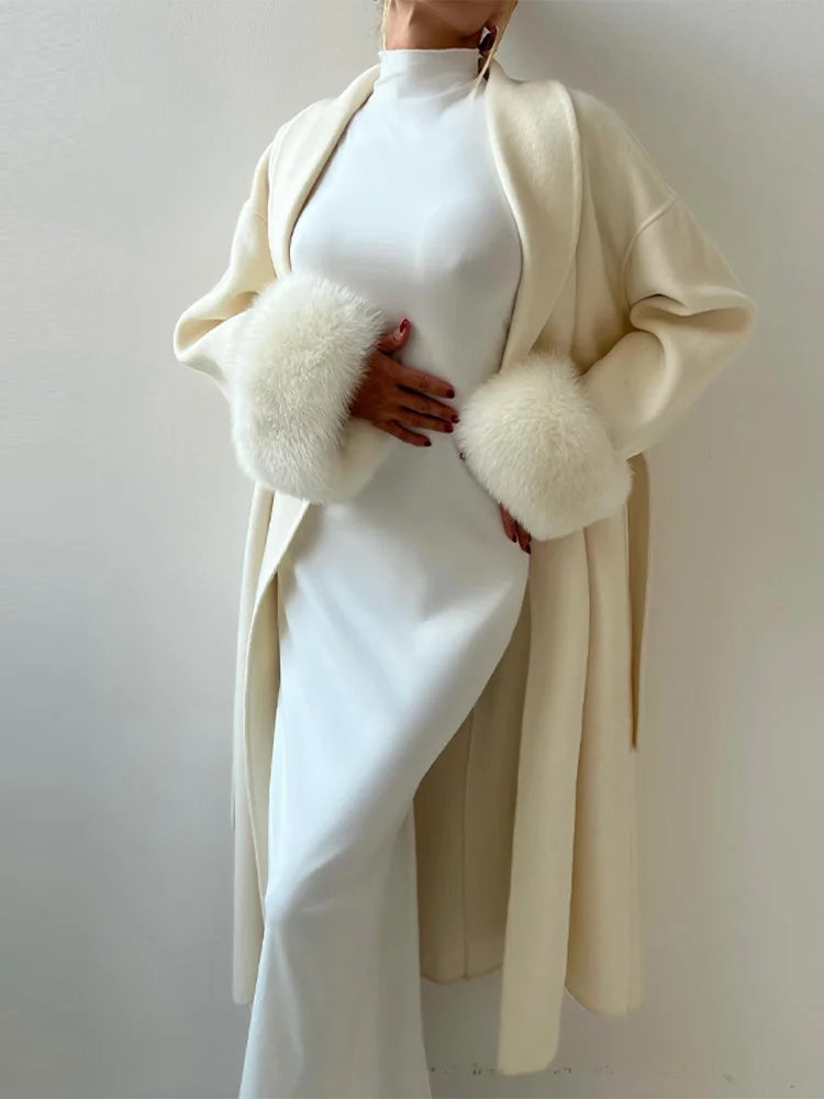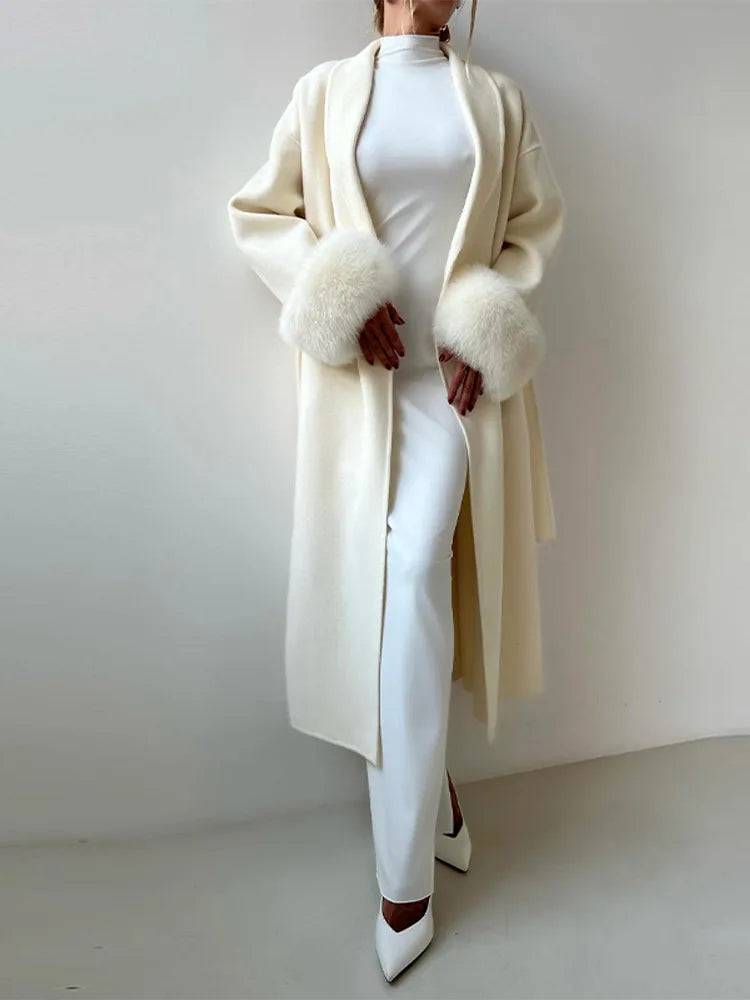 معطف طويل أنيق بقصة عصرية، بياقة على شكل حرف V، وأشرطة دانتيل، وتفاصيل متداخلة. مصنوع من البوليستر، مثالي للسهرات والمناسبات الاحتفالية.