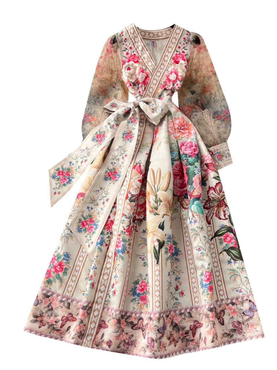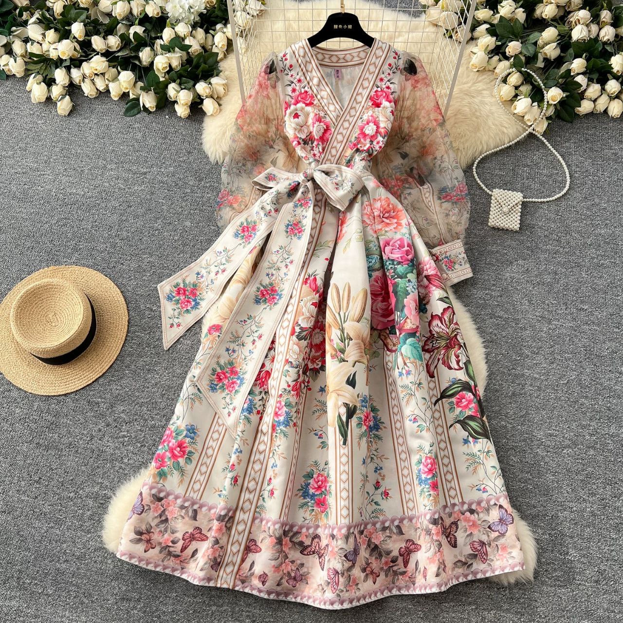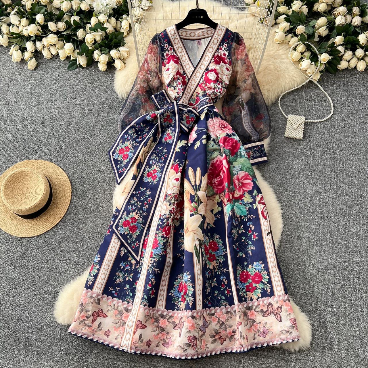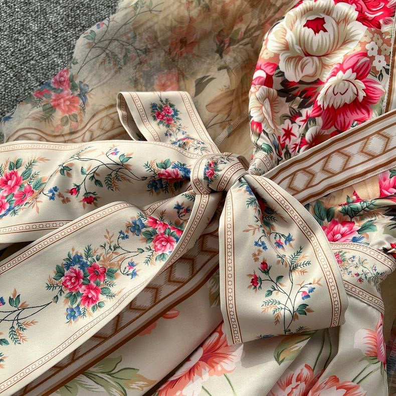 فستان أنيق بطباعة موضعية وخصر متأرجح عريض يمنح طلة راقية ومميزة، مستوحى من الطراز الفرنسي، مناسب للمناسبات والظهور الأنيق.