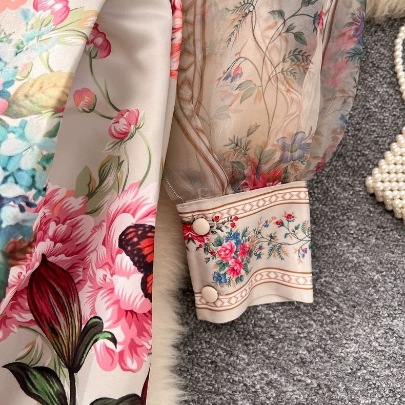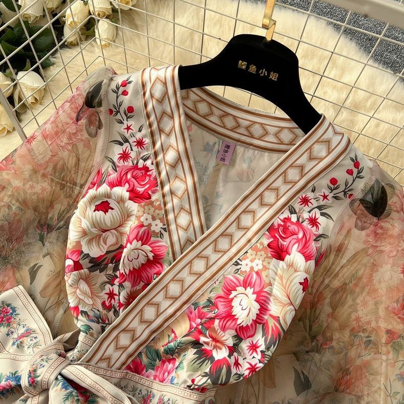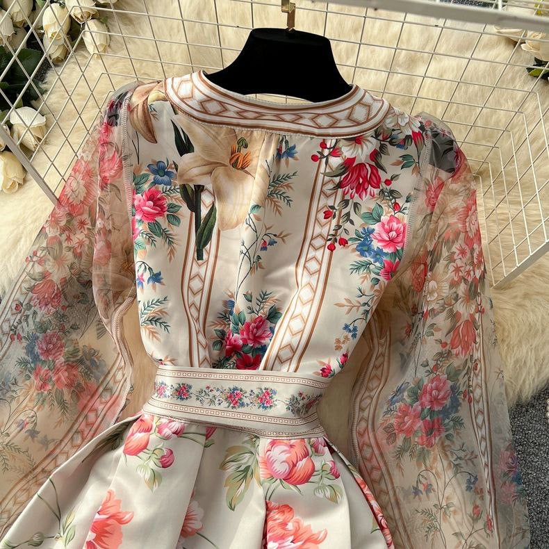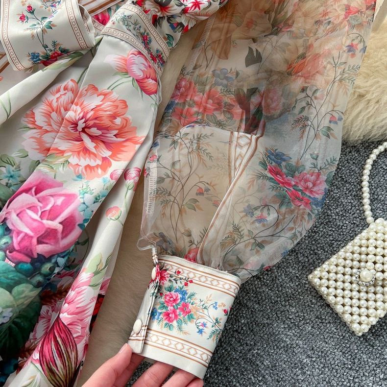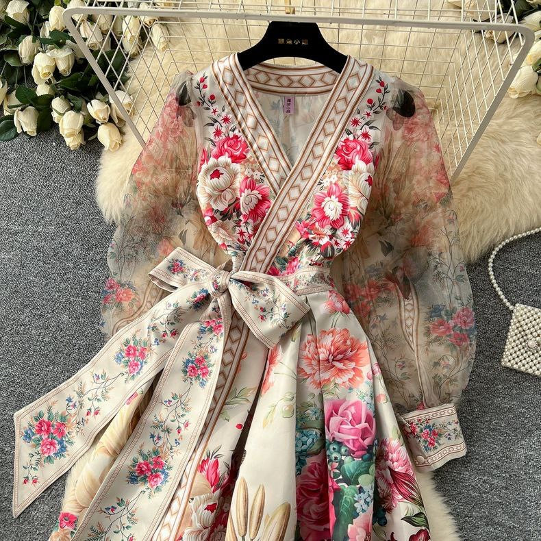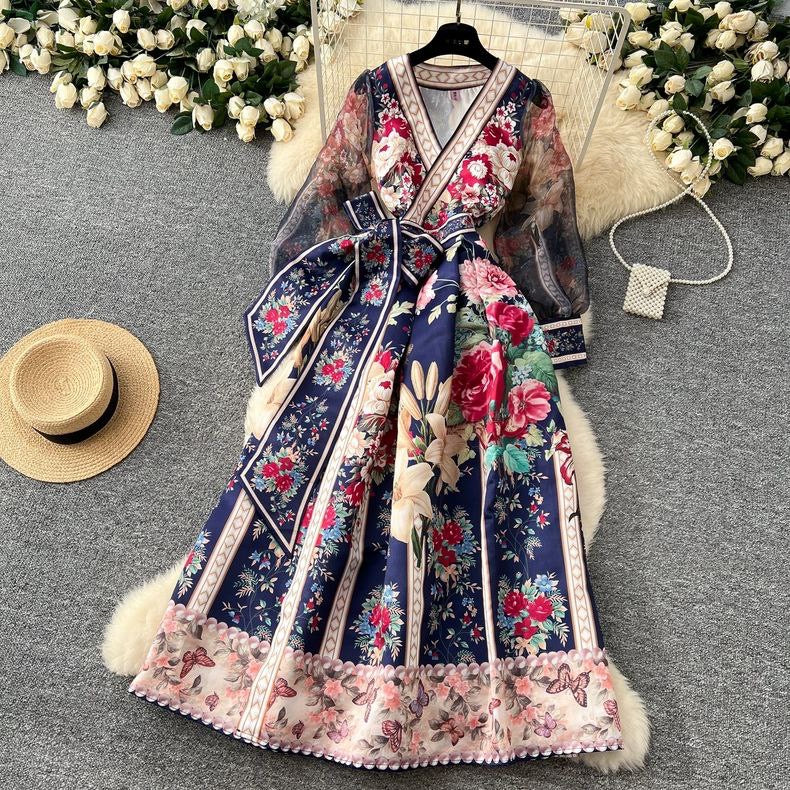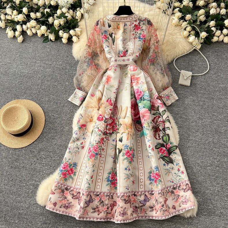 Graceful long-sleeve women's dress featuring placed print and a wide swing waist design. Inspired by noble French style – ideal for elegant occasions.