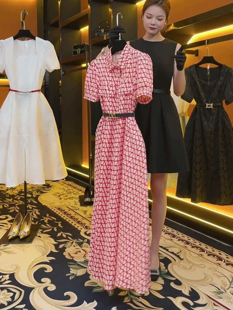 فستان نسائي صيفي نحيف، قميص بولو منقوش يغطي البطن ويقلل من مظهر العمر – لون زهري