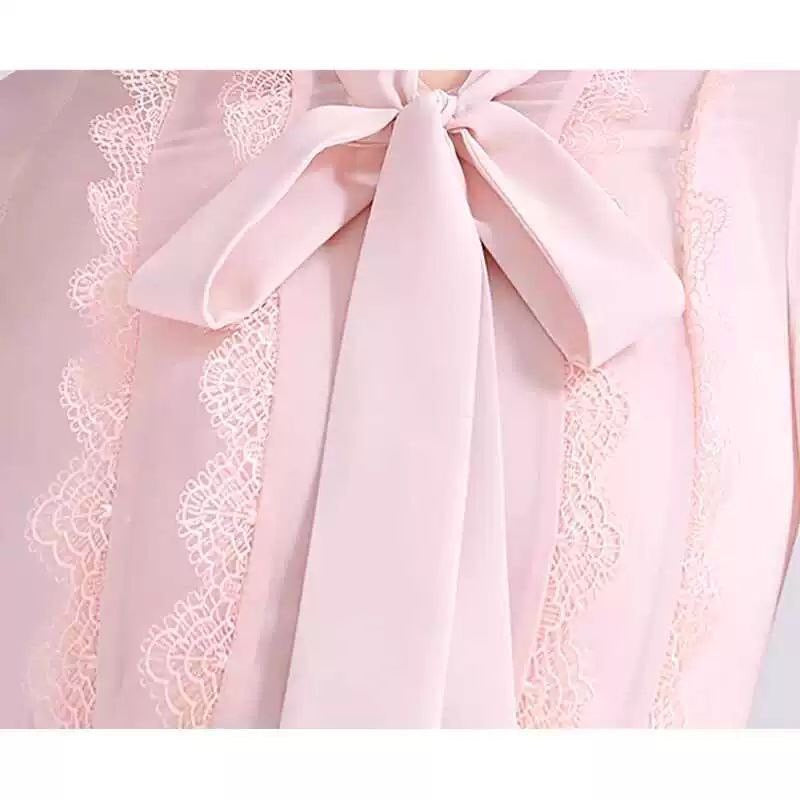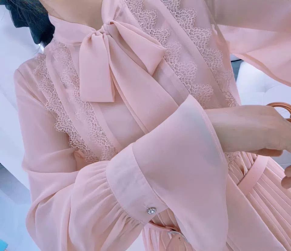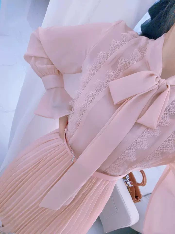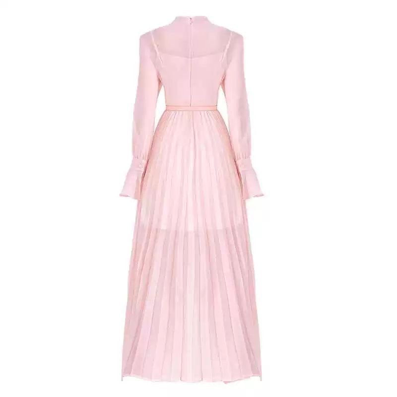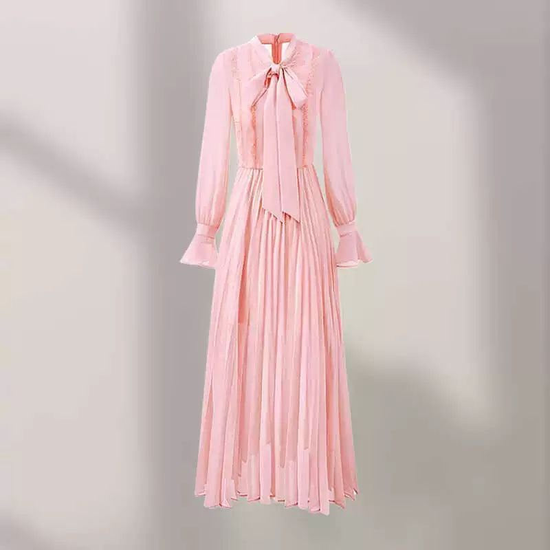 French Chiffon Maxi Dress – Pink Pleated Summer Elegance with Long Sleeves