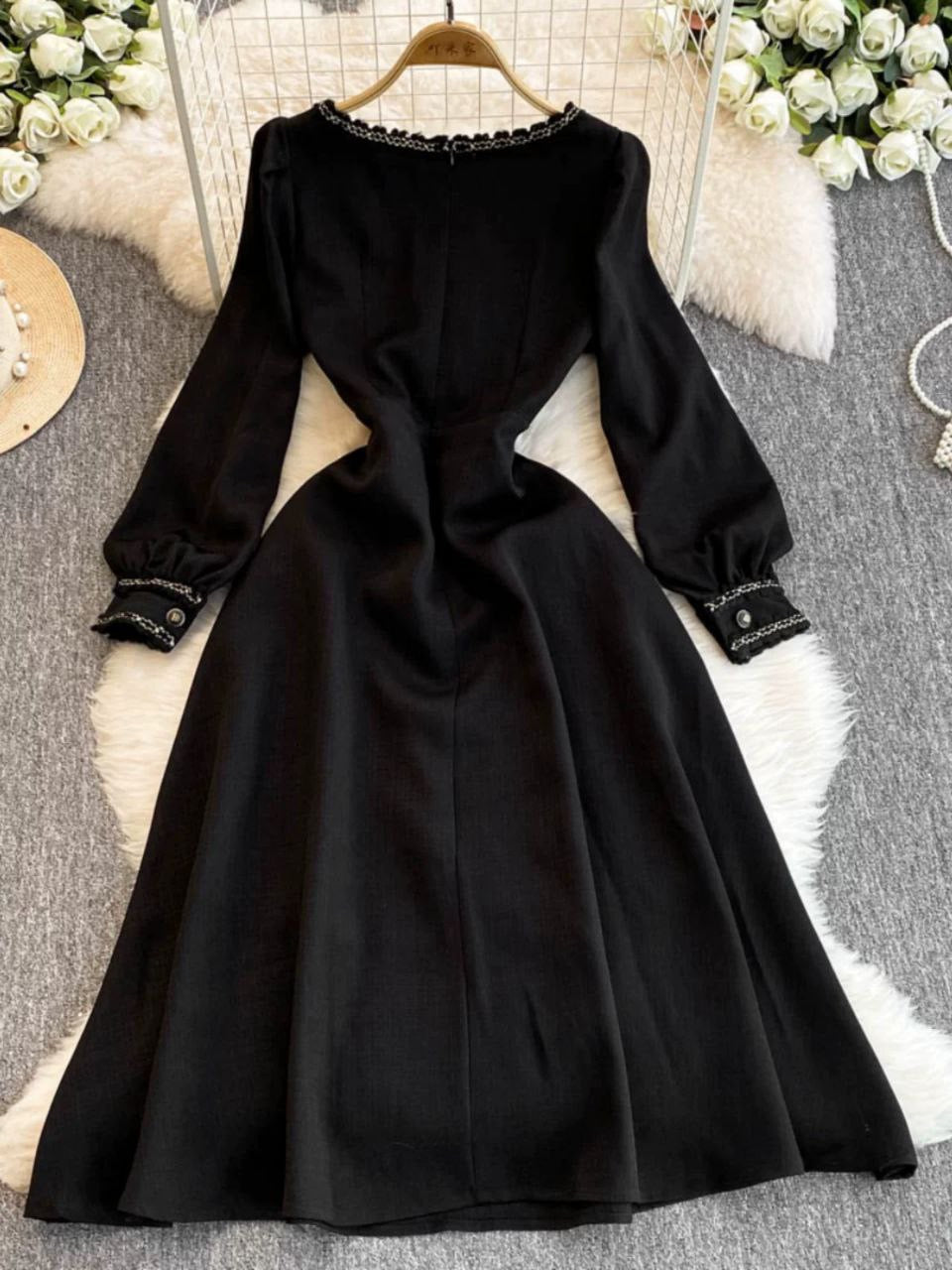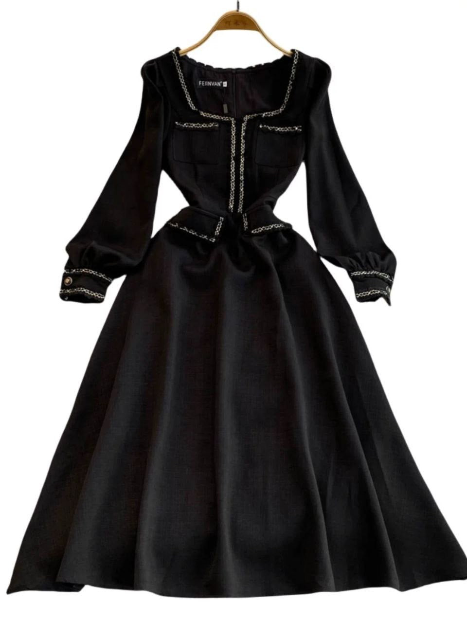 Französisches Hepburn-Kleid mit langen Ärmeln und quadratischem Ausschnitt