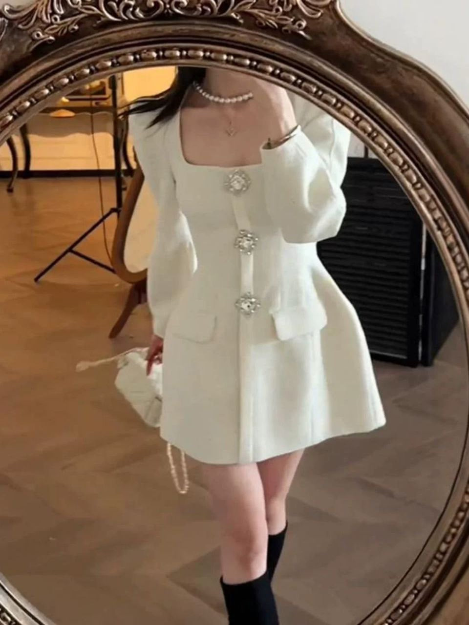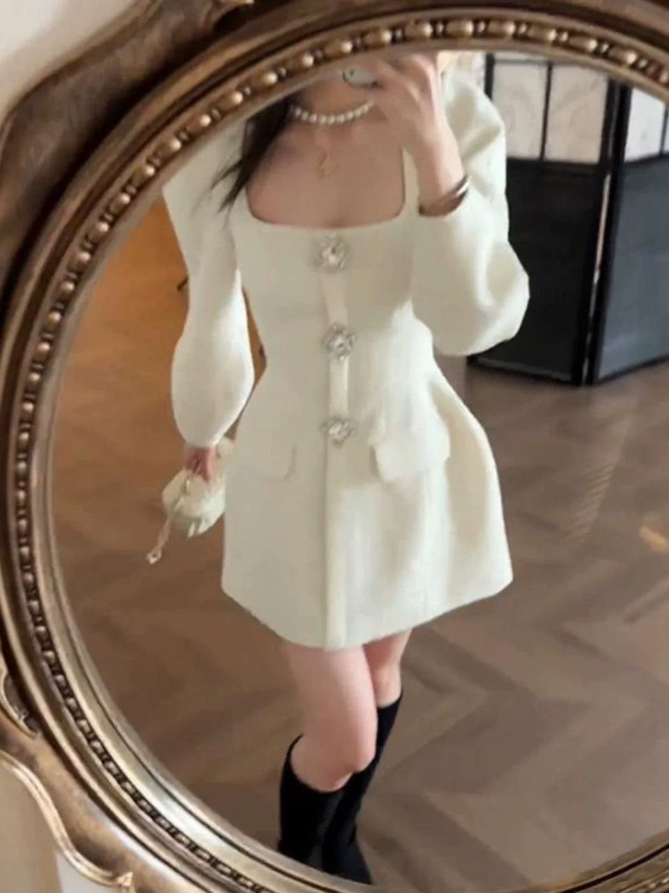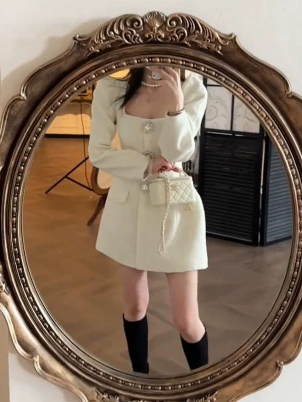 فستان شانيل أبيض على الطراز الفرنسي للنساء، تصميم ربيعي جديد، خصر فاخر خفيف وفستان عيد ميلاد تنحيف