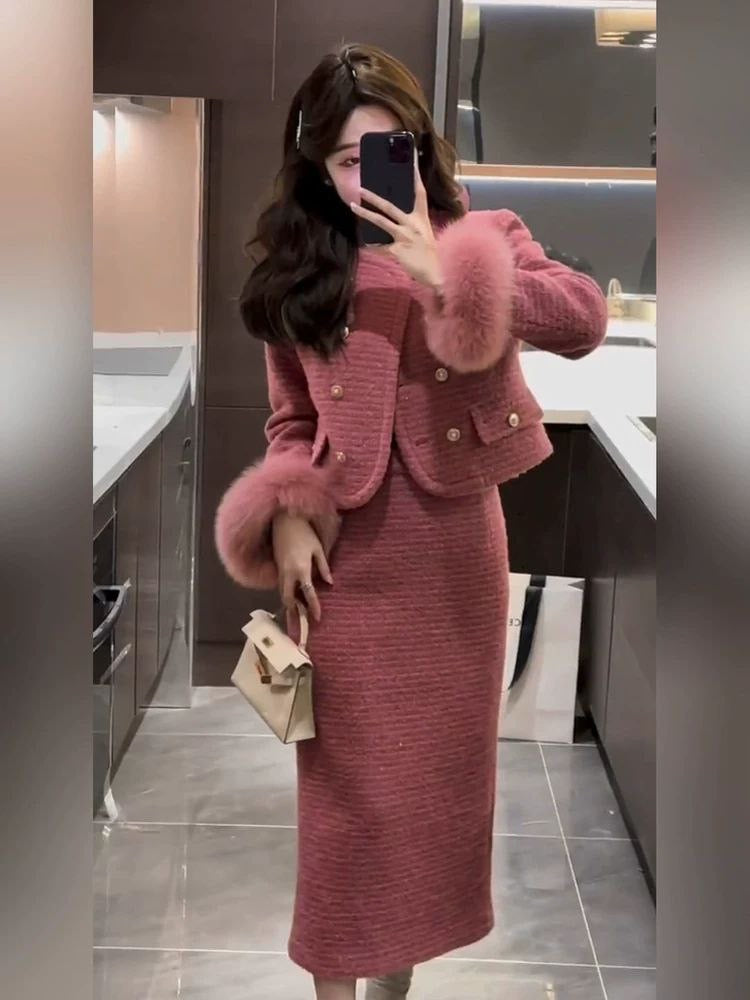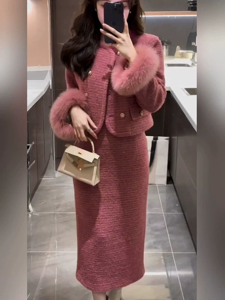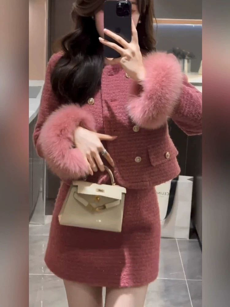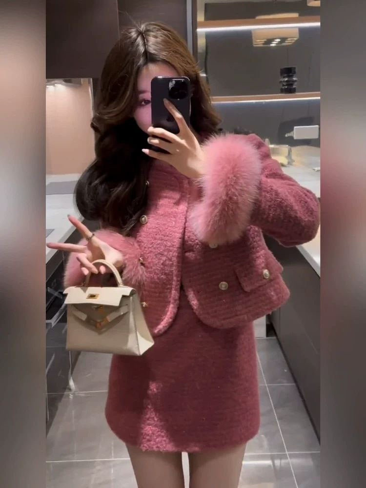 Elegant two-piece set inspired by retro Chanel designs — high-waisted wool coat paired with either a short or long skirt. Perfect for a luxurious “rich girl” autumn/winter look.