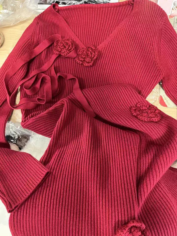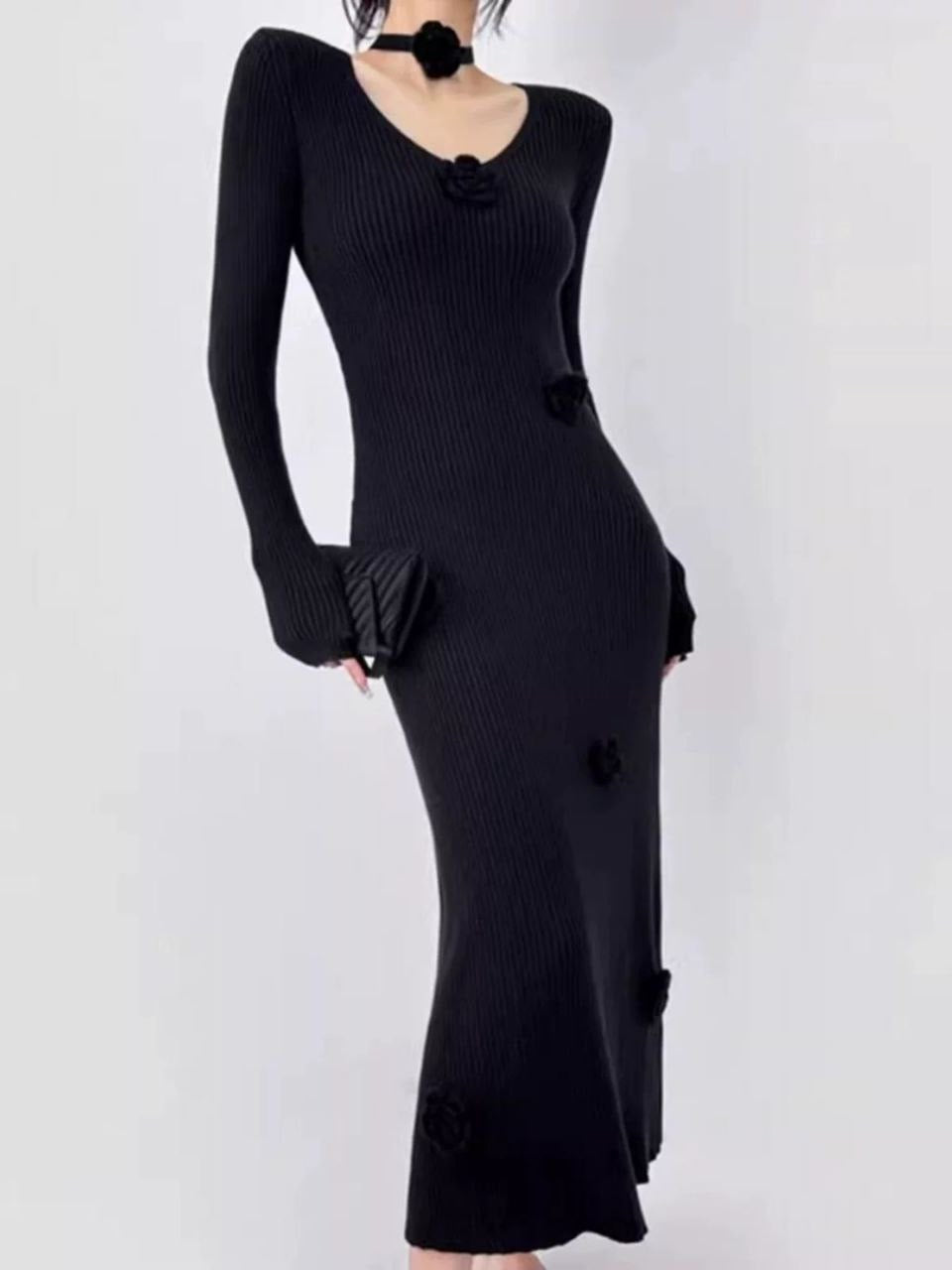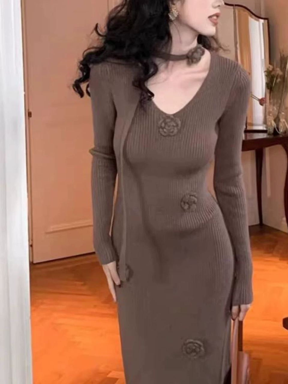 فستان محبوك رفيع عالي الجودة على الطراز الفرنسي للنساء في الخريف والشتاء رومانسي ثلاثي الأبعاد برقبة على شكل حرف V ملفوف حول الورك طويل