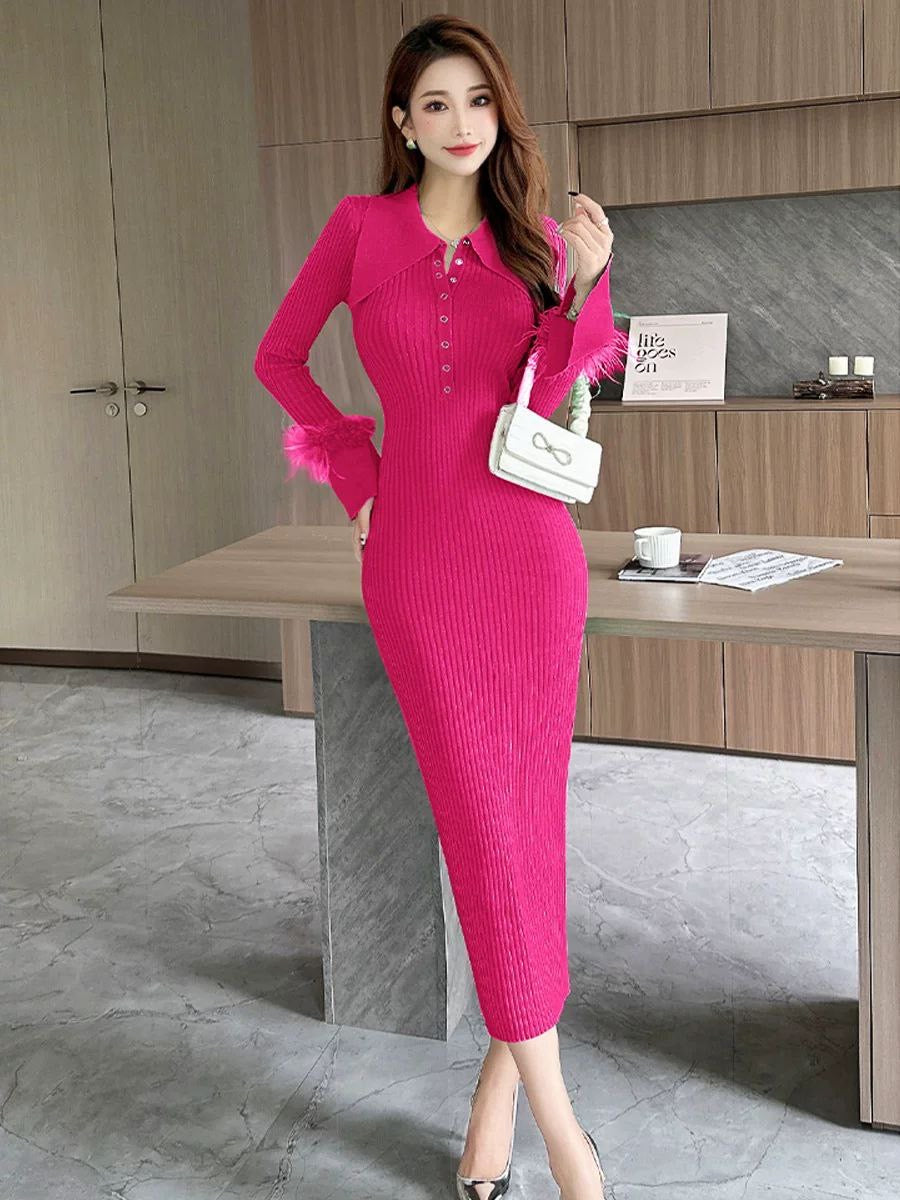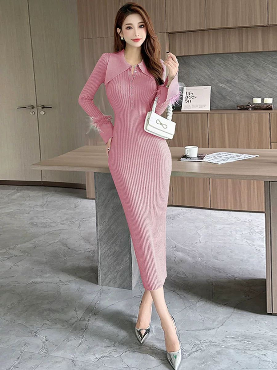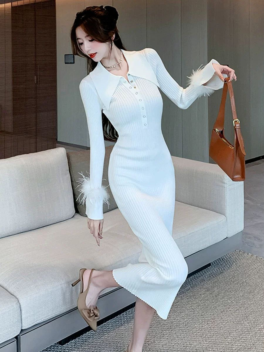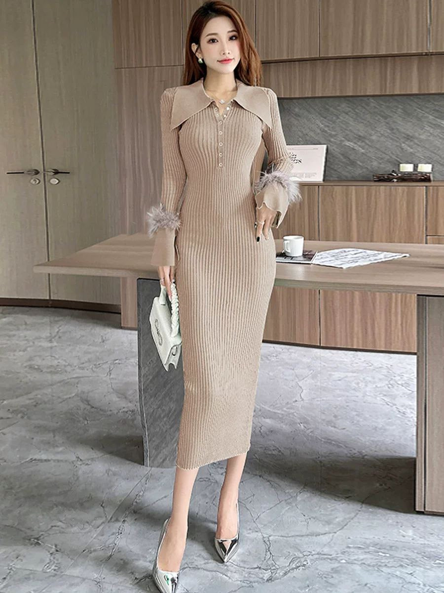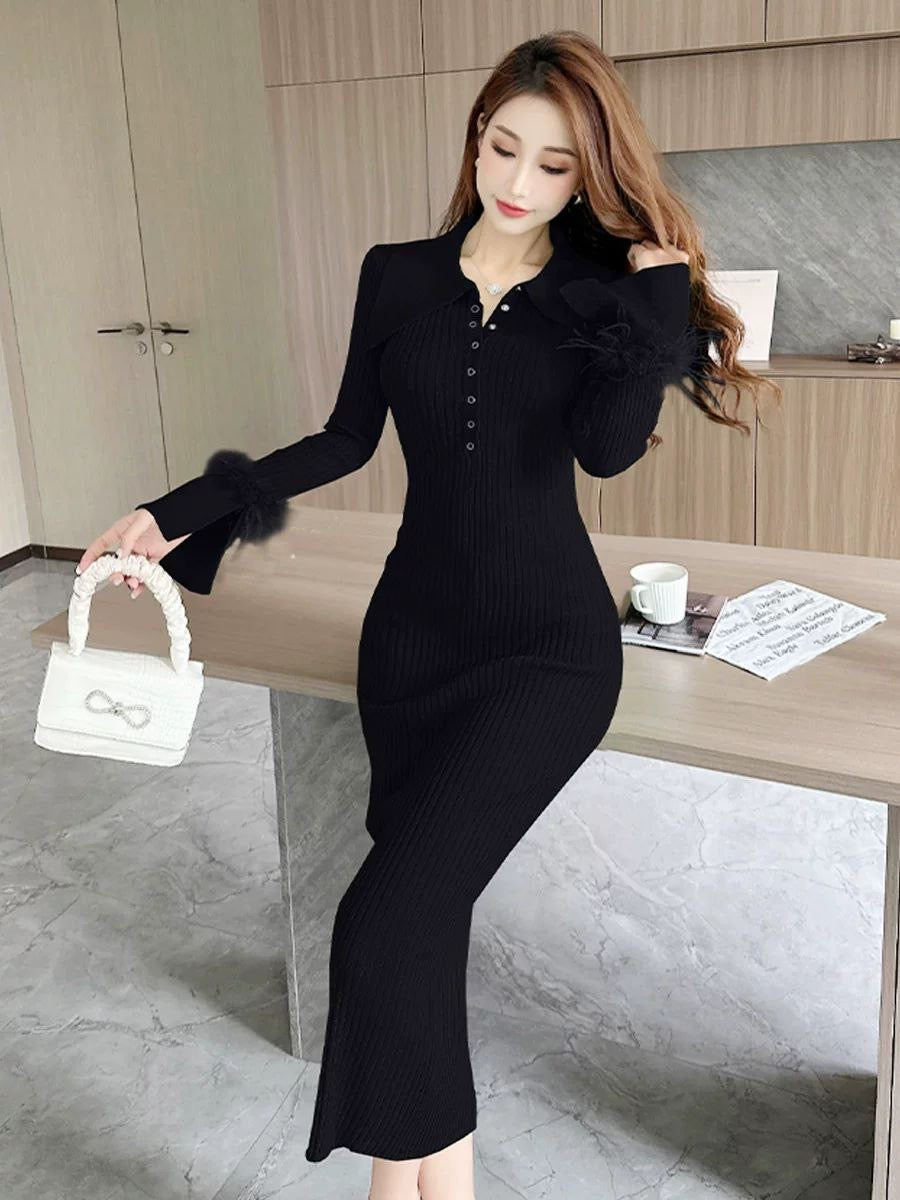 Knitted dress for women in autumn and winter, French-style pointed collar, elegant vibe, fur sleeves, slim fit, and hip-wrapping lower skirt.