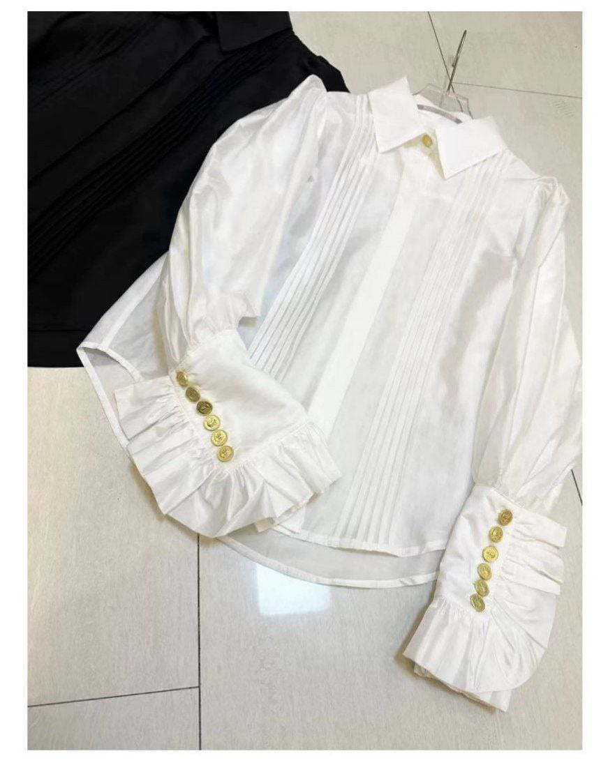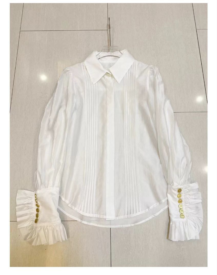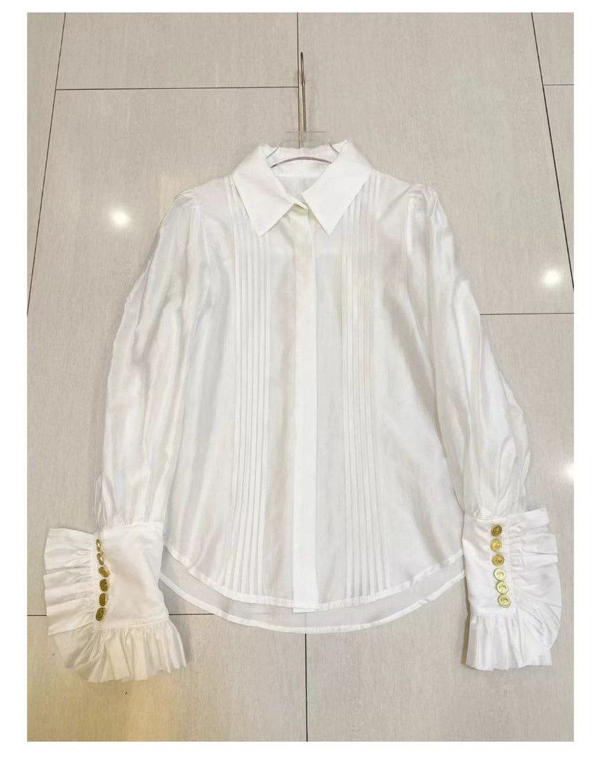 قميص نسائي أبيض مطوي على الطراز الفرنسي - تصميم أكمام ثلاثي الأبعاد متقدم