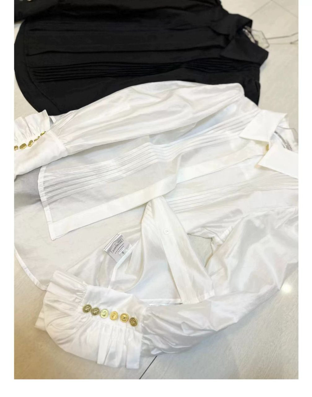 يتميز هذا القميص الأبيض الأنيق ذو الطراز الفرنسي بأكمام ثلاثية الأبعاد متطورة وتصميم بزر واحد من طبقات الجزء العلوي. تضفي تقنية الطي ثلاثية الأبعاد الفريدة لمسة عصرية، بينما يضمن التصميم الفضفاض الراحة والأناقة الكاجوال. مصنوع من أقمشة ناعمة ومسامية، مثالية للارتداء طوال اليوم.