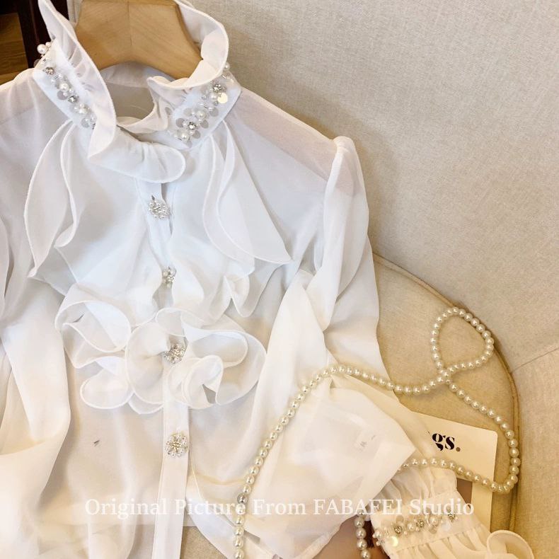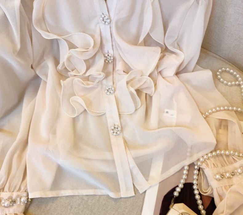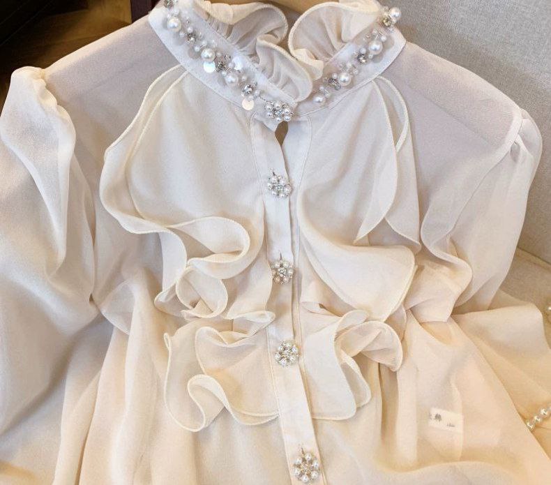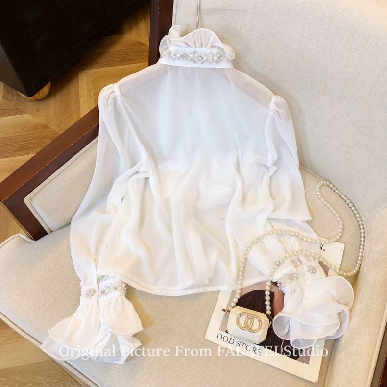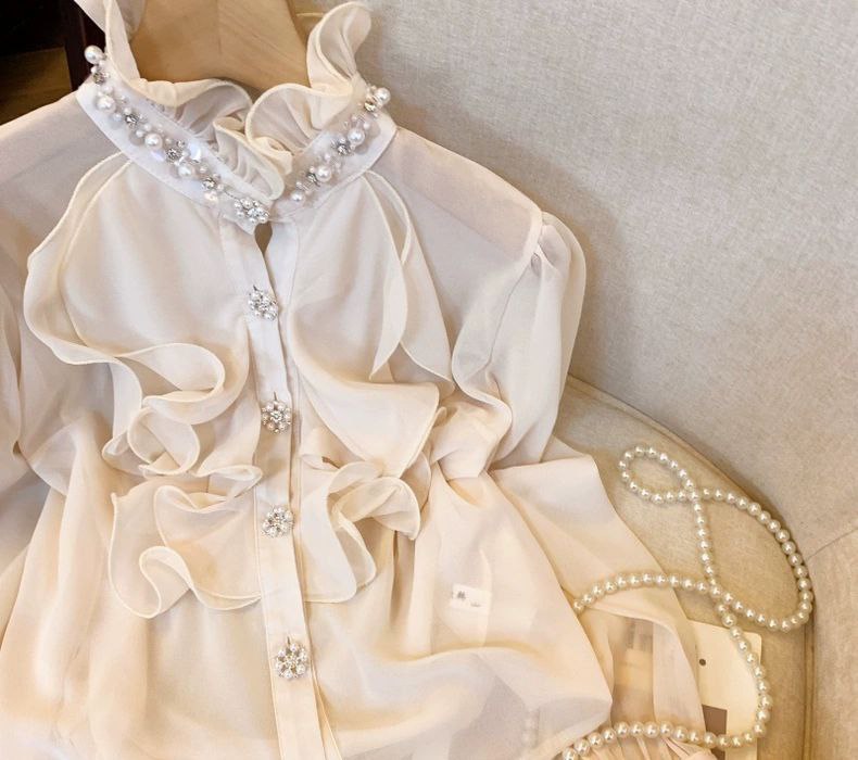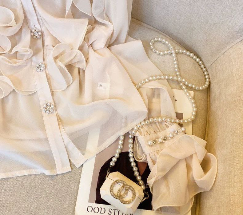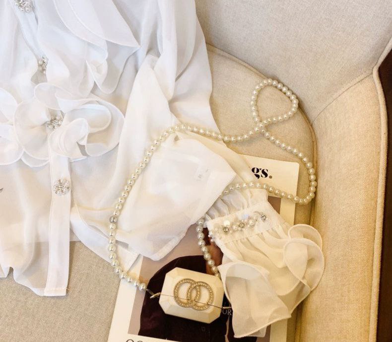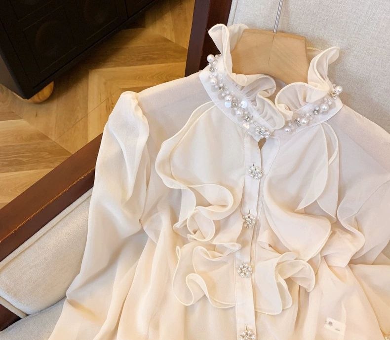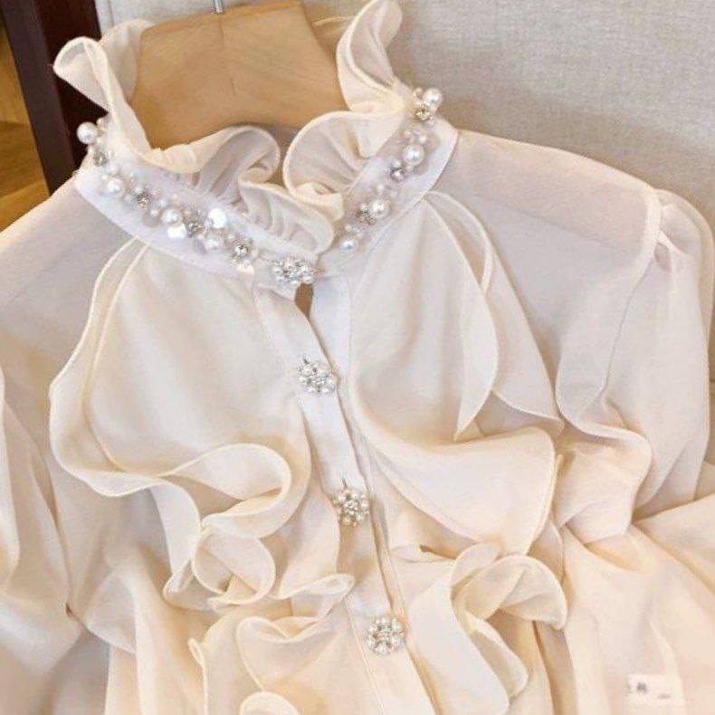 بلوزة بيضاء مزينة بكشكشة على الطراز الفرنسي من تي مول، تتميز بكشكشة أنيقة وتطريزات أحجار الراين الثقيلة. تتميز هذه البلوزة الفاخرة من الشيفون بأكمام واسعة وتصميم رومانسي، مثالية لأمسيات الخريف وإطلالتك النهارية الأنيقة.
