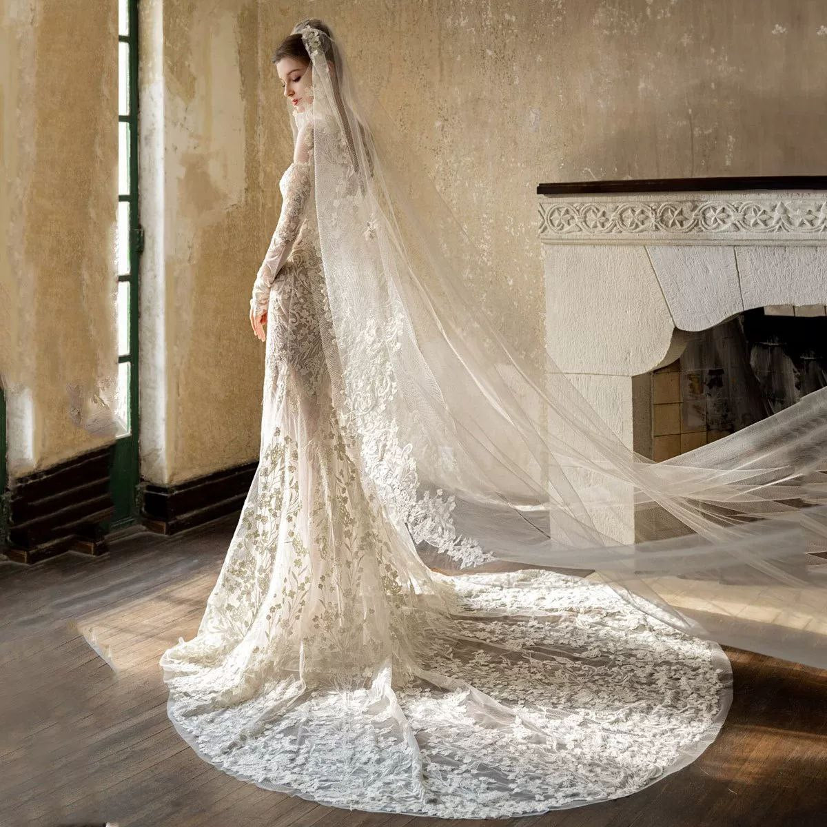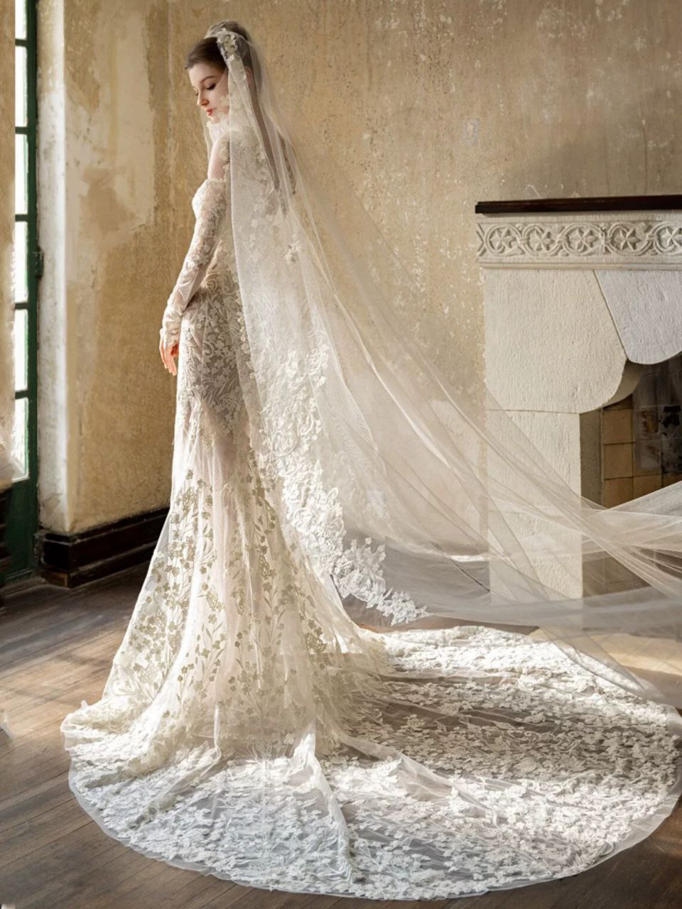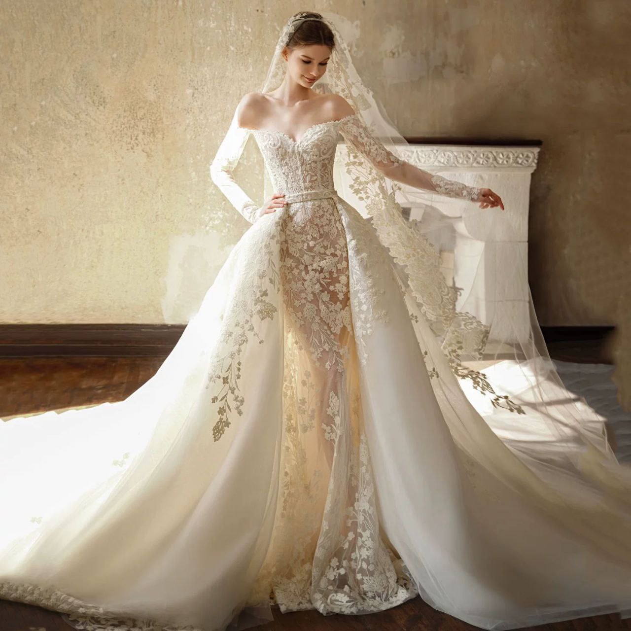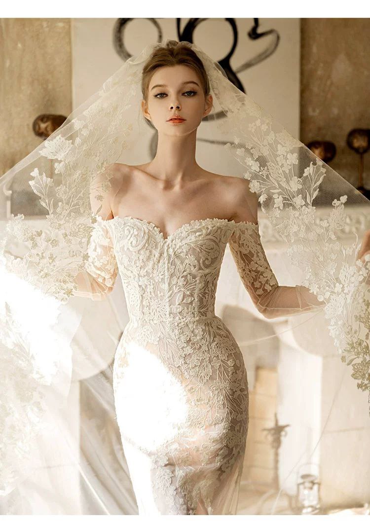 This elegant French lace wedding dress features a one-shoulder design with a sophisticated mermaid silhouette. Crafted with high-quality materials, it is perfect for brides looking for a graceful and luxurious look. The dress is also suitable for formal evening occasions.