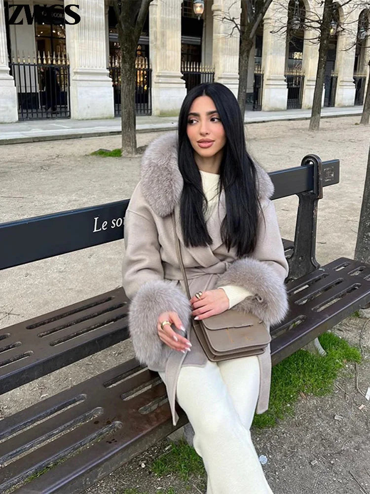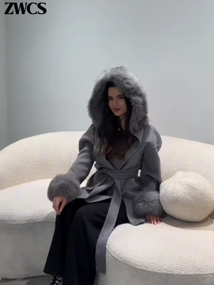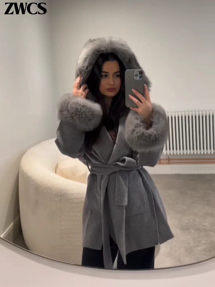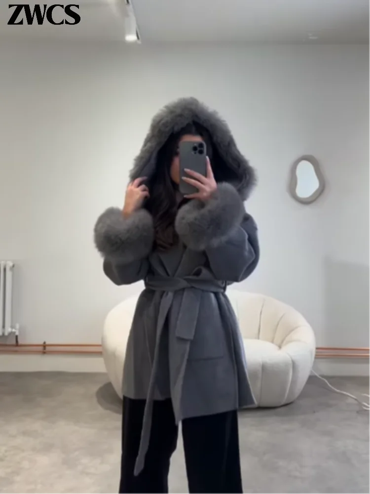 معطف صوف بغطاء رأس من الفرو المرقع برباط