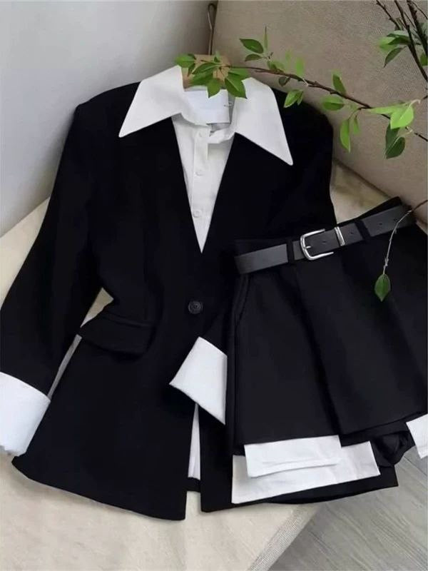 بدلة فتاة ساخنة بطراز الرغبة الخالصة، جديدة للربيع والخريف، مكونة من سترة علوية وتنورة نصف الطول مع حزام. تصميم شبابي عصري من قطعتين.