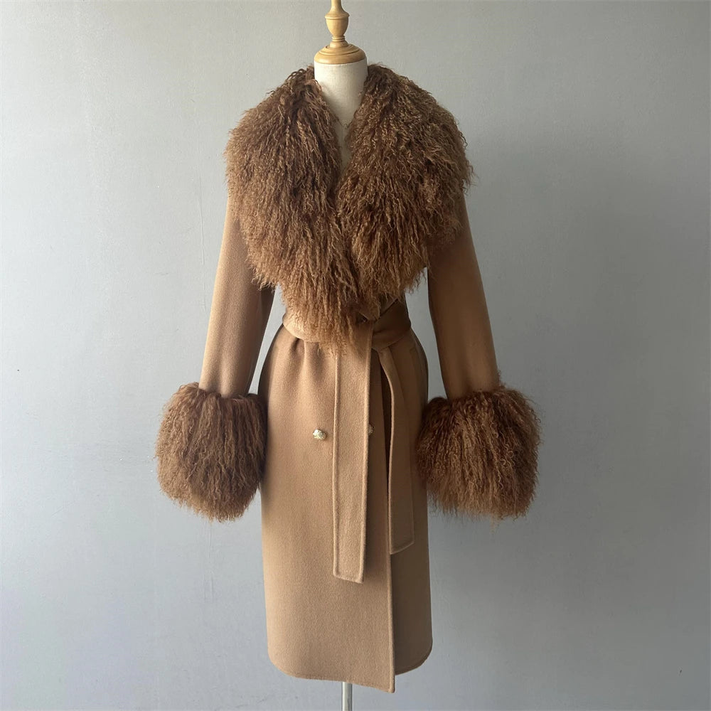 معطف صوف مع طوق وحزام من فرو الثعلب
