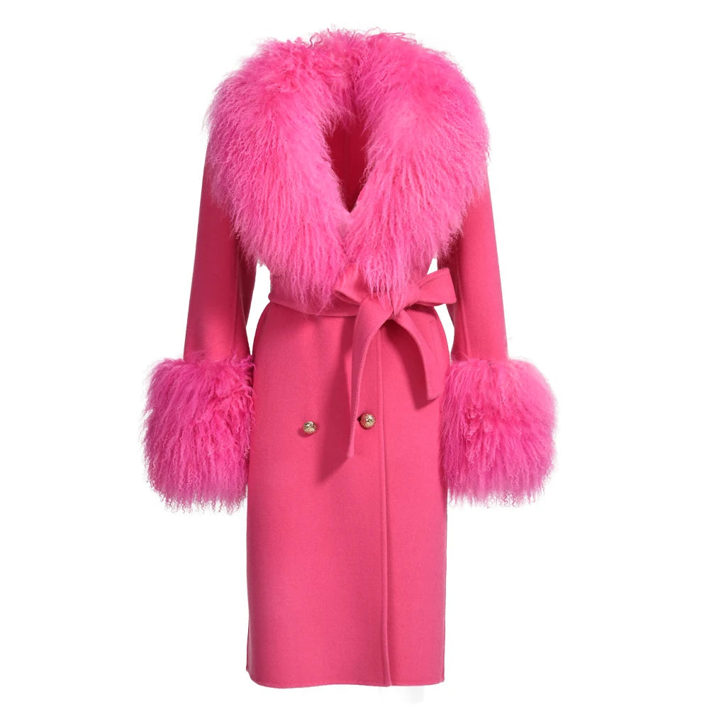 معطف أنيق من الصوف، بياقة وأساور من فرو الثعلب الطبيعي الأصلي. يأتي مع حزام مطابق لمظهر أنيق. مثالي للارتداء في الشتاء مع إطلالة عصرية.