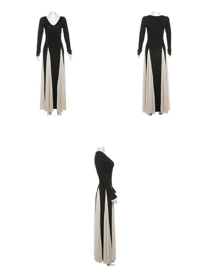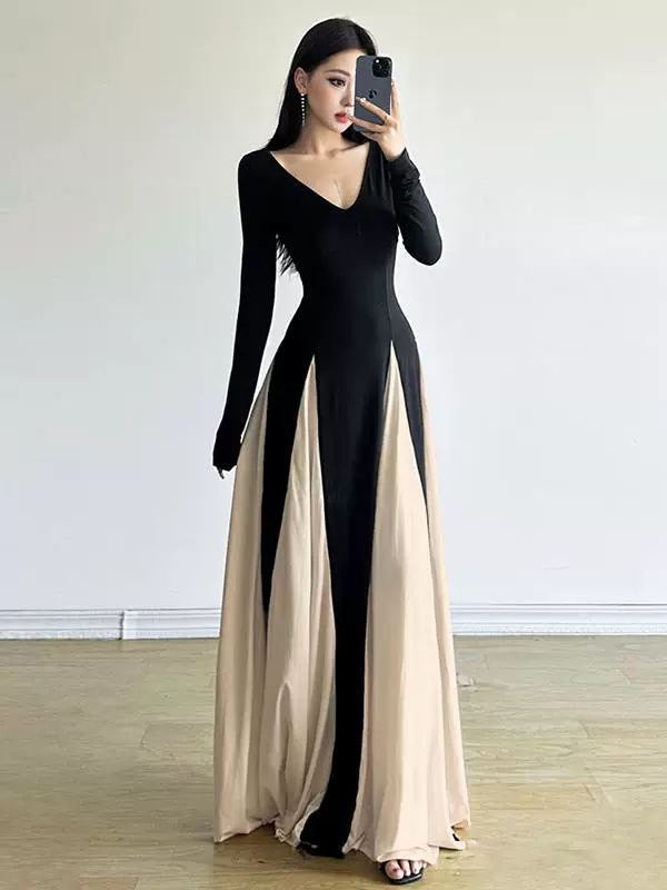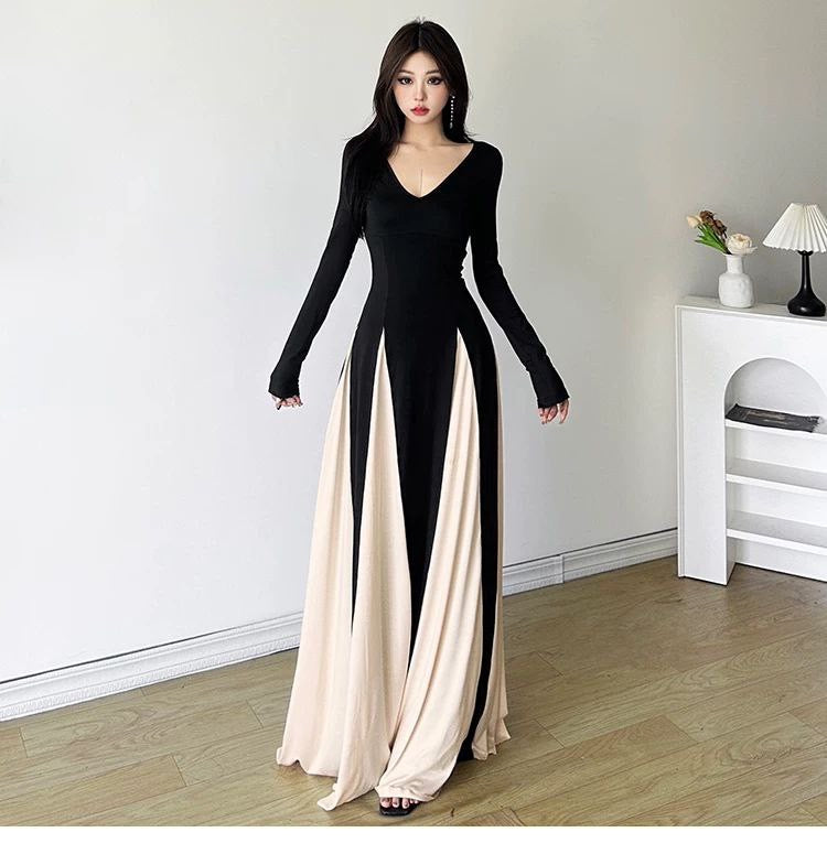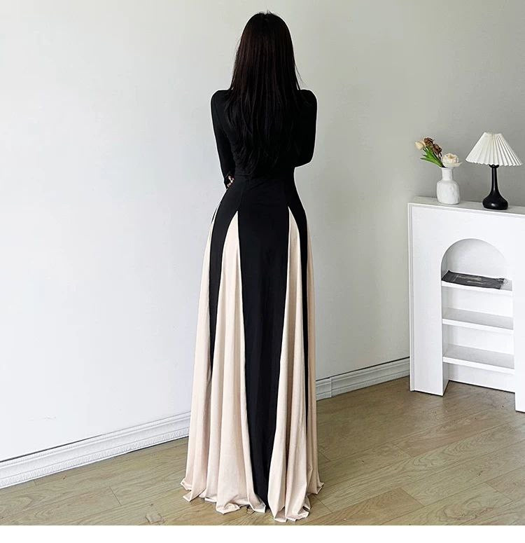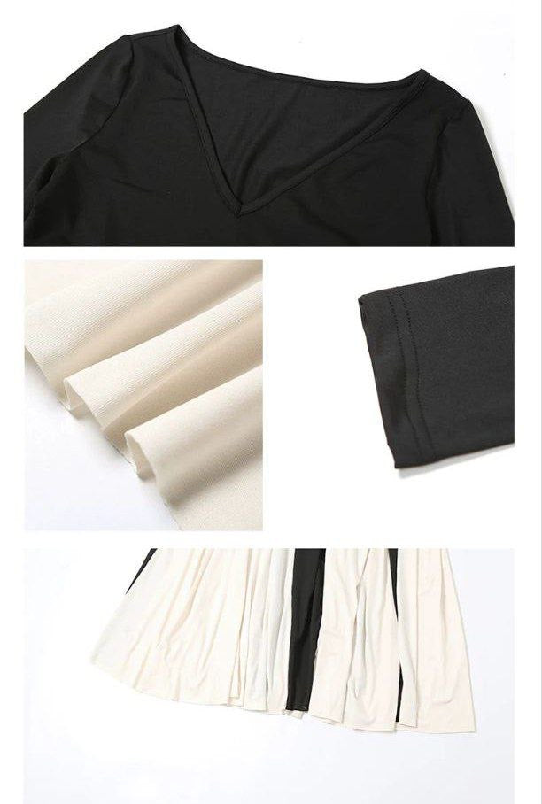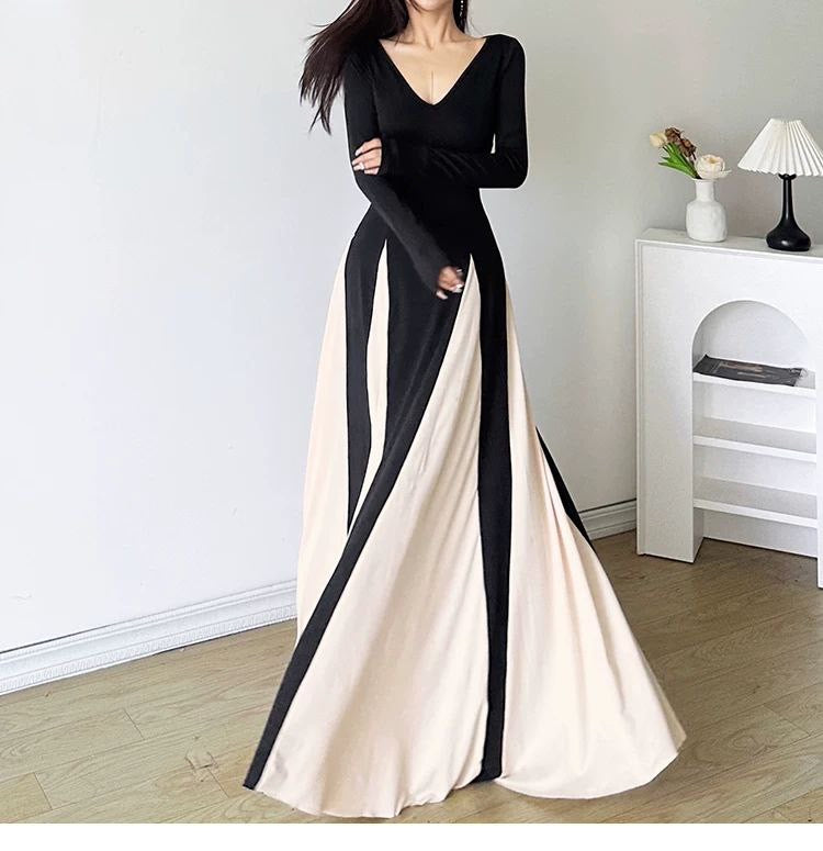 تصميم كلاسيكي أنيق بلونين متباينين – فتحة رقبة على شكل V – أسلوب فرنسي أنثوي
