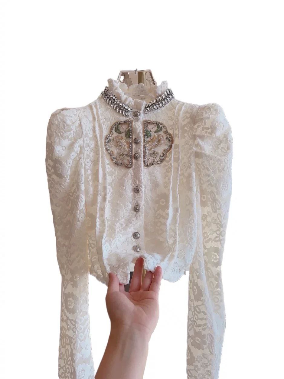 بلوزة نسائية خريفية من الدانتيل مستوحاة من الطراز الكوري - بلوزة مزينة بالخرز