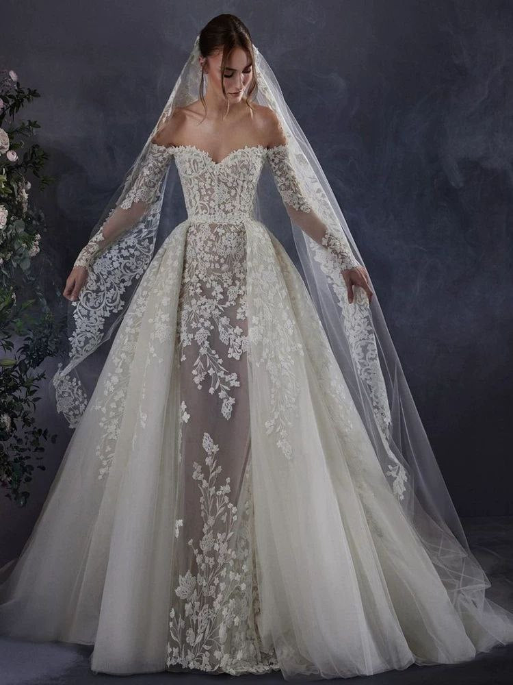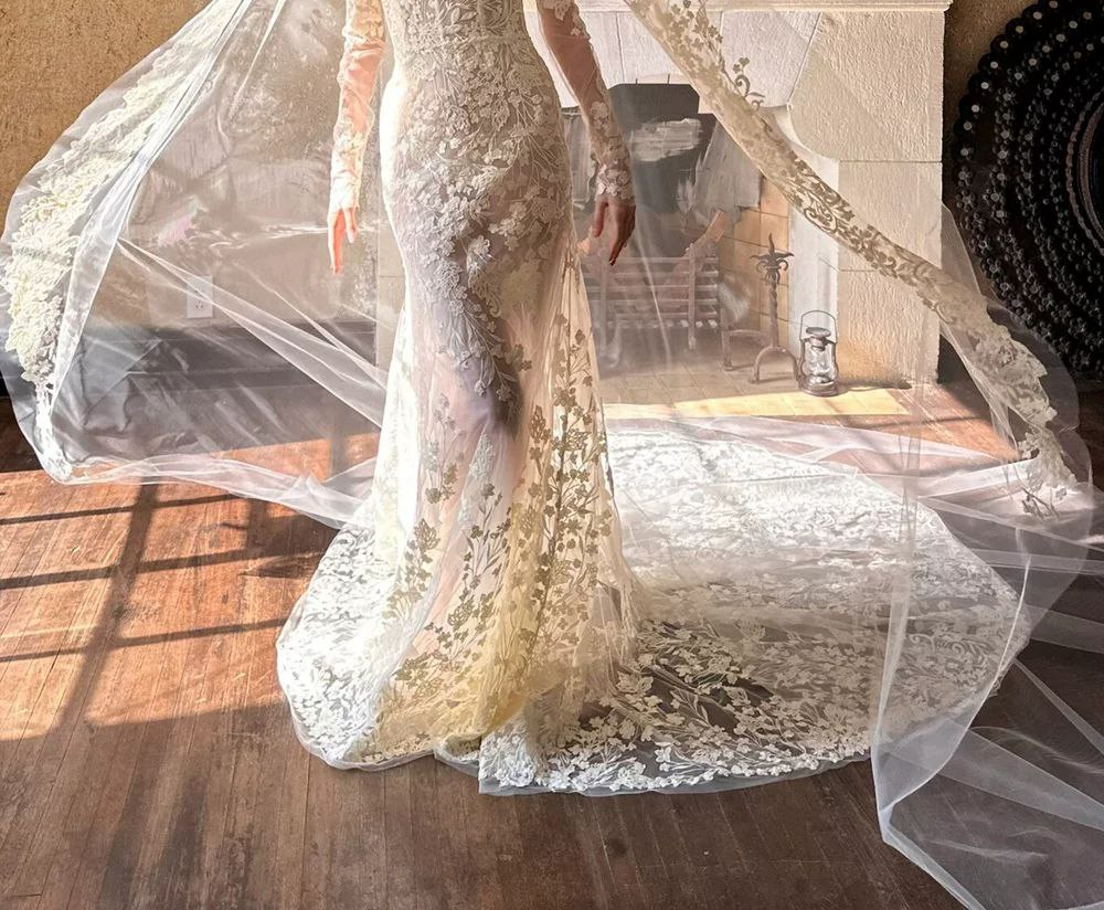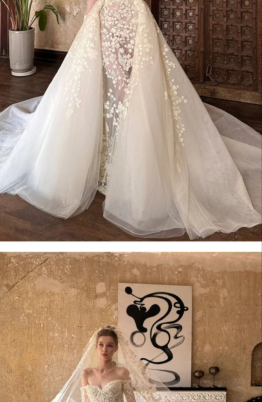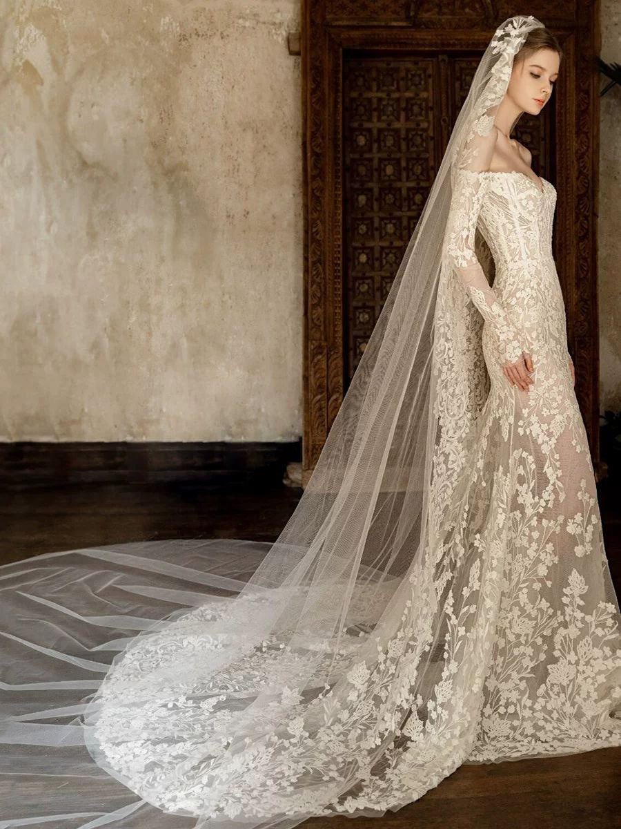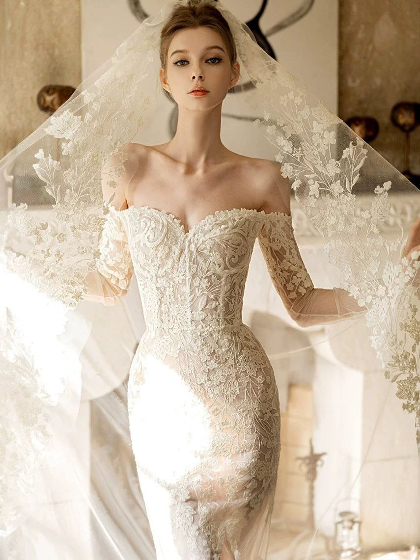 This high-quality lace mermaid wedding dress features long sleeves and a one-shoulder design. A French-style long decorative veil completes the elegant bridal look. The exquisite lace fabric creates charming lines for a true three-dimensional shaping effect.
