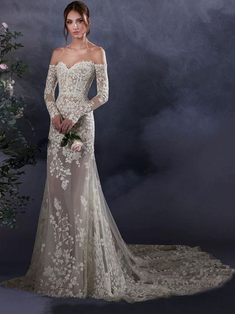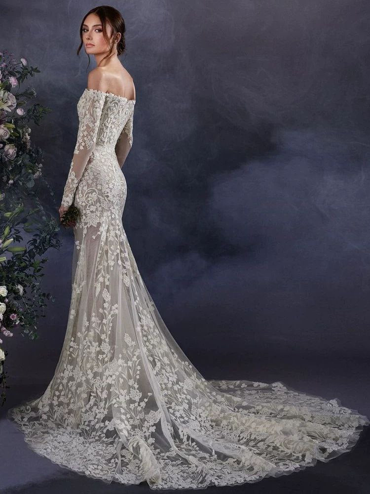 Long-Sleeve One-Shoulder Lace Mermaid Wedding Dress