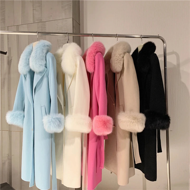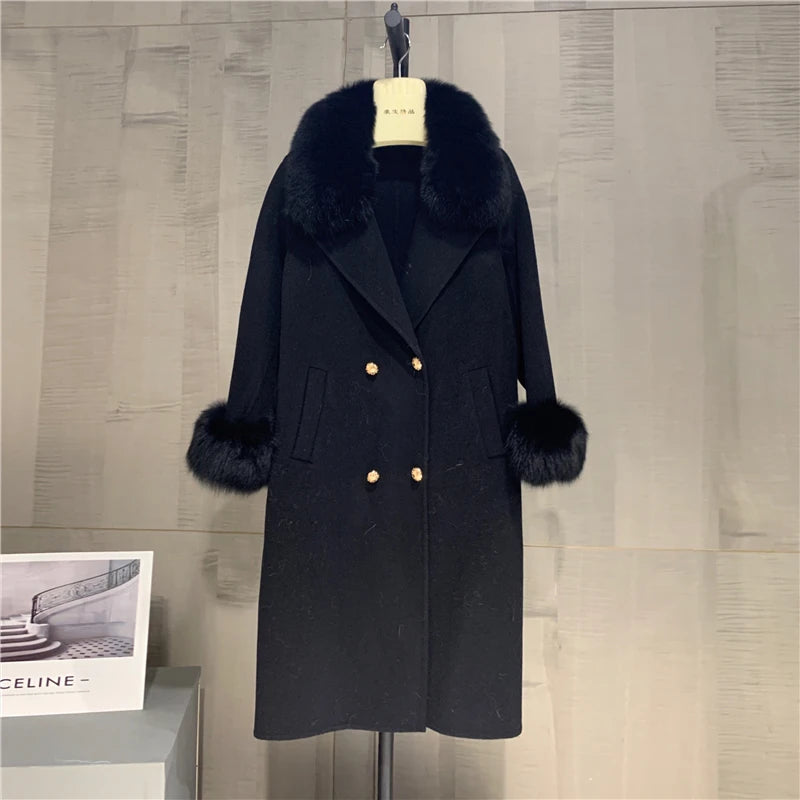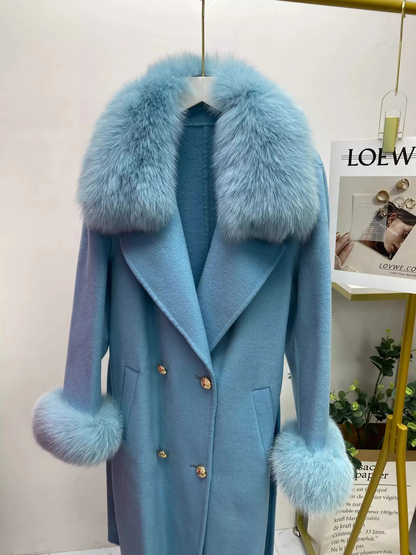 معطف طويل مزدوج الصدر من الفرو الحقيقي