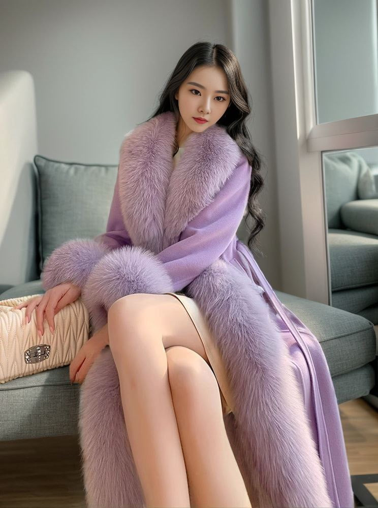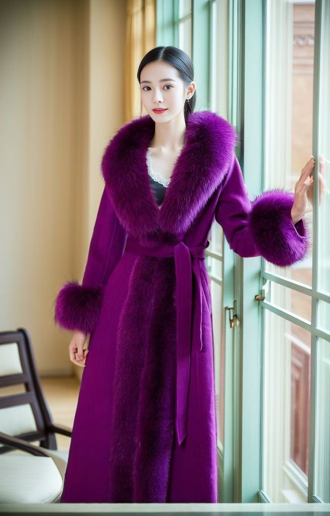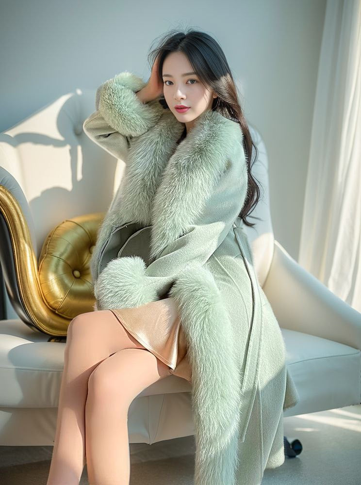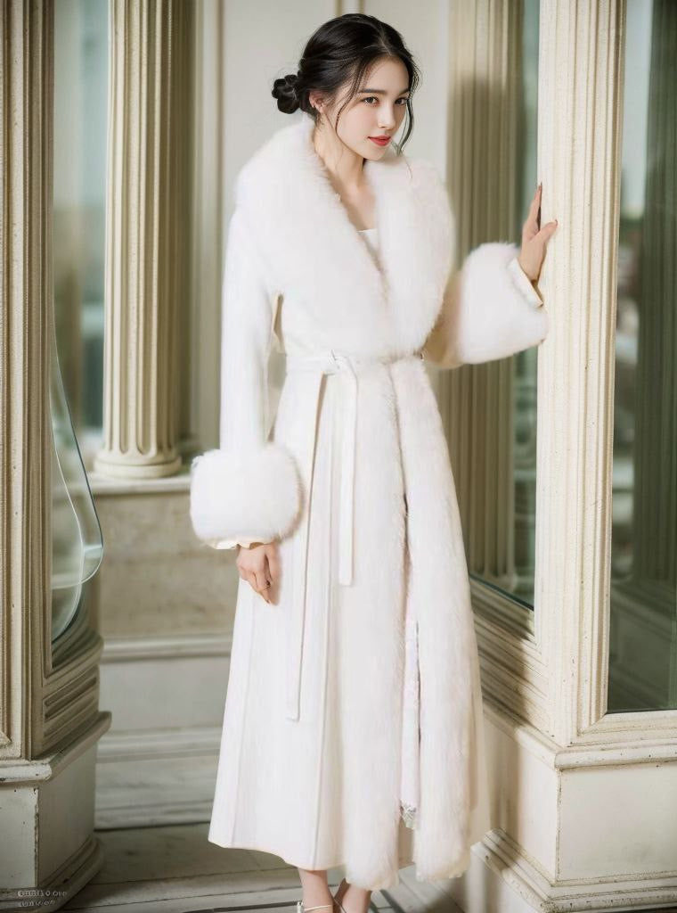 معطف صوفي طويل وطويل مناسب للخريف والشتاء، ذو قصة ضيقة، وفاخر، وياقة من فرو الثعلب المقلد