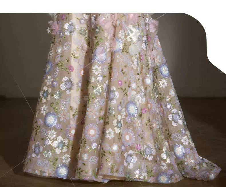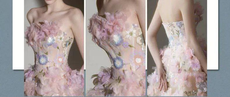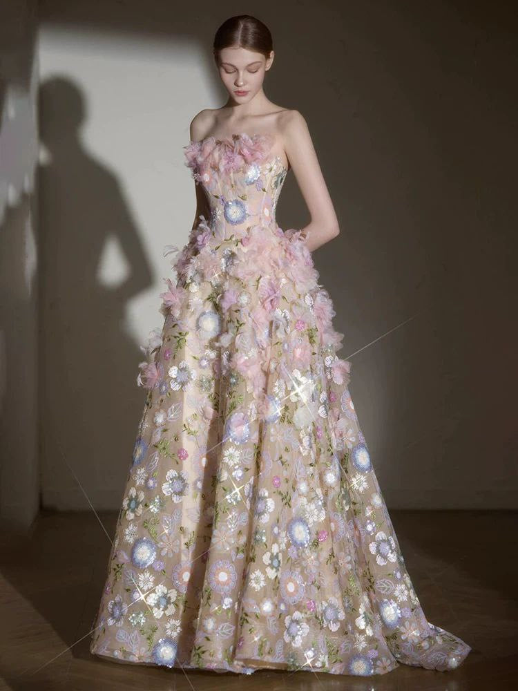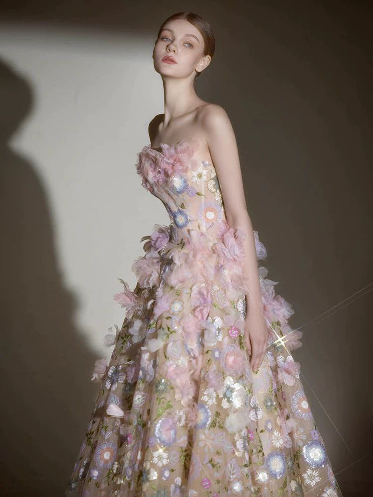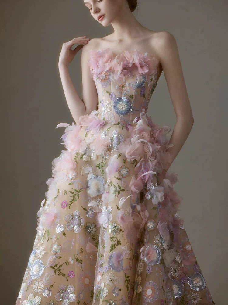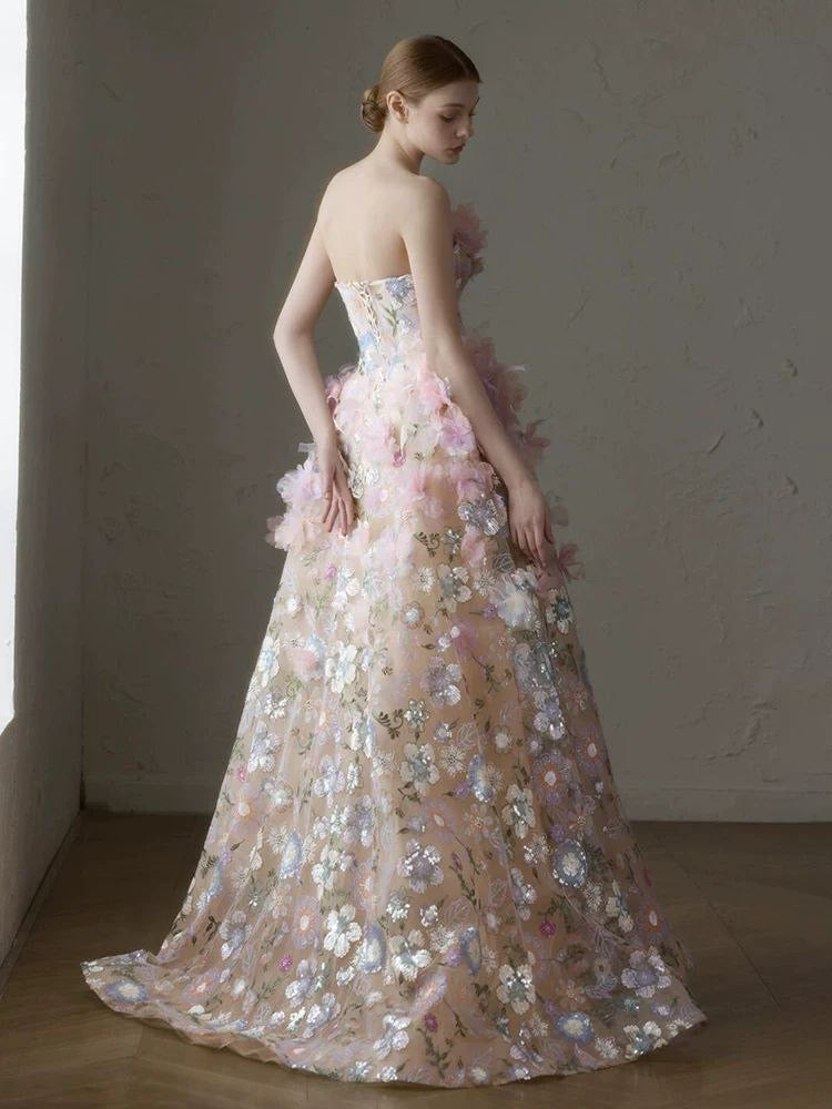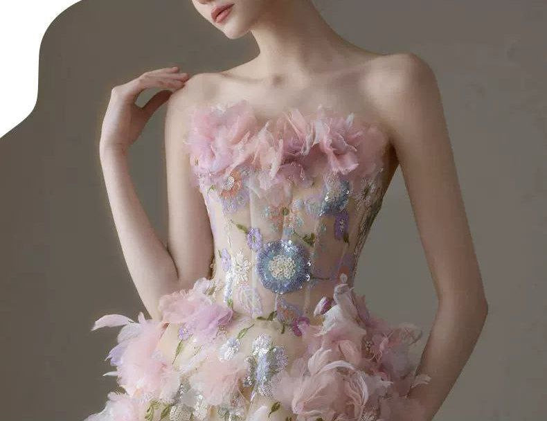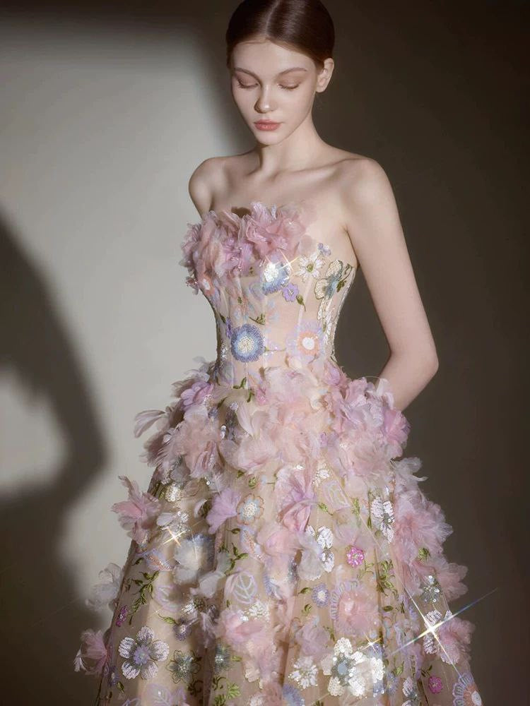 فستان سهرة فاخر جديد من الأعلى الأنبوب، مزين بالزهور بستايل أنثوي ناعم، مثالي لحفلات الزفاف أو عيد الميلاد