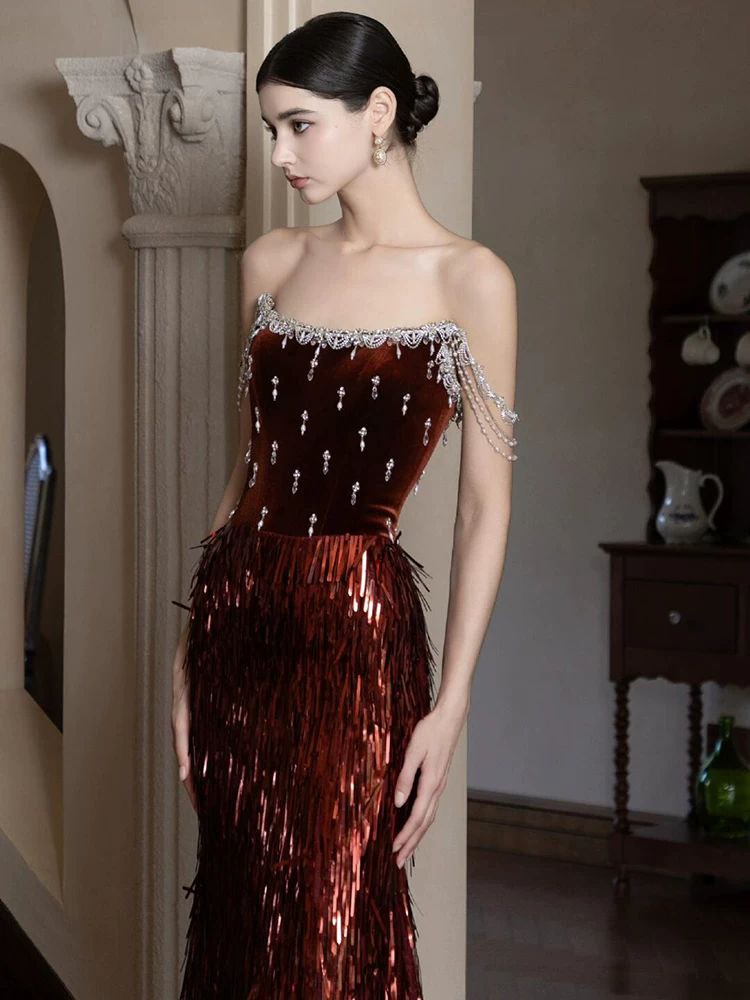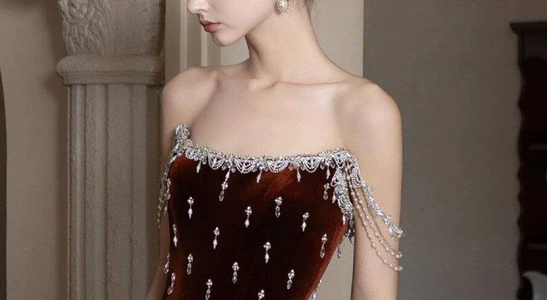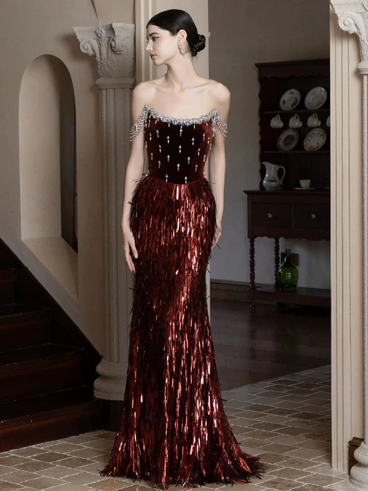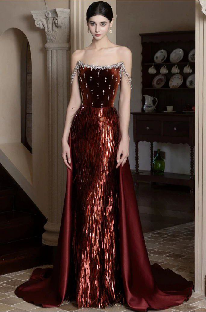 This elegant evening gown is designed with a one-shoulder style and a glamorous mermaid tail silhouette. The heavy beadwork adds sparkle and sophistication, making it perfect for weddings, elite parties, and high-class celebrations.