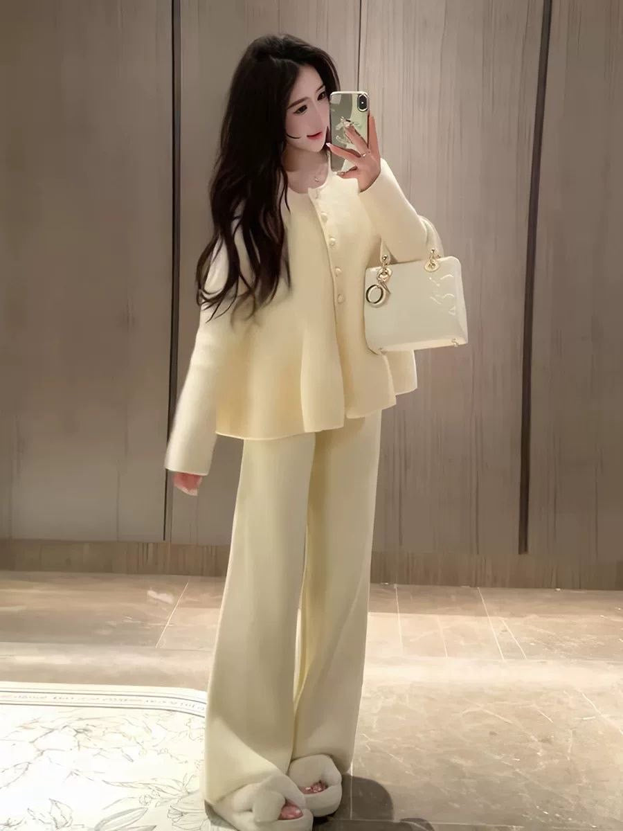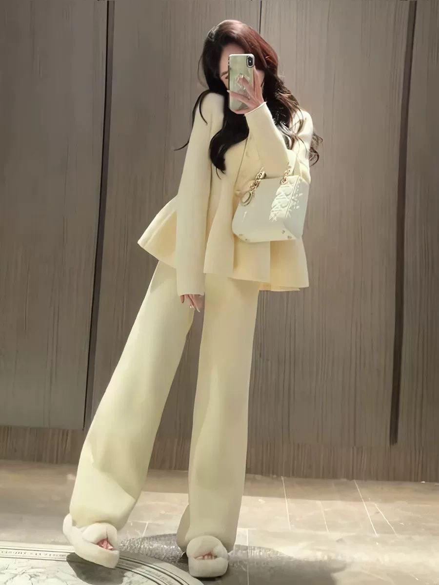 Maillard Two-Piece Knit Set – French Ruffled Cardigan & Straight-Leg Pants