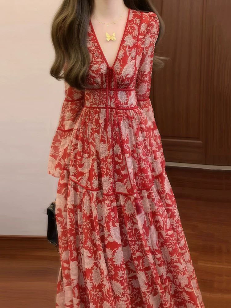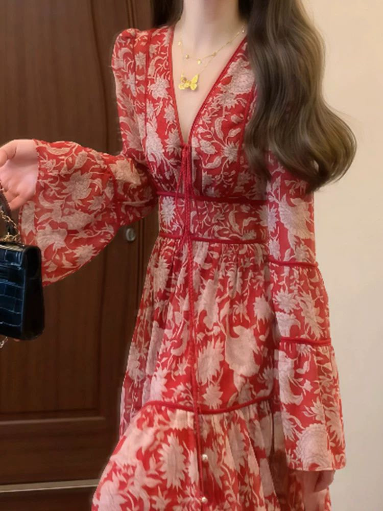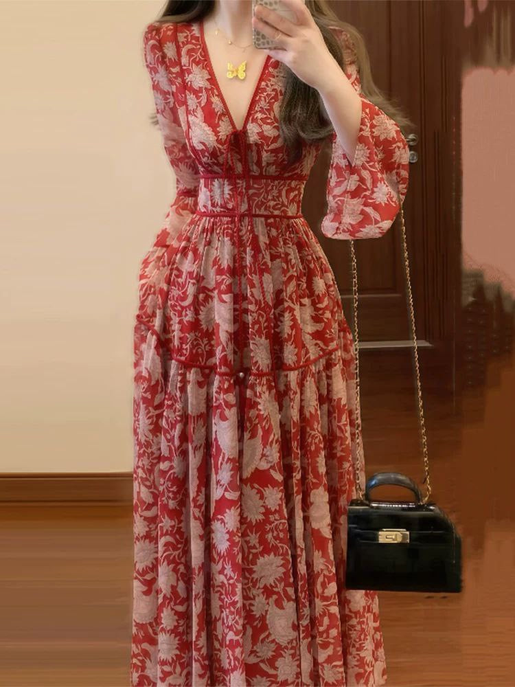New Ethnic Red Summer Dress V-Neck Bell Sleeves Long Skirt Large Size