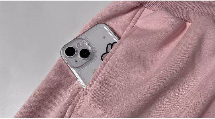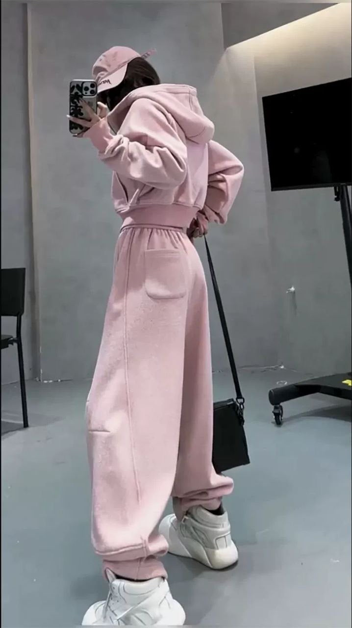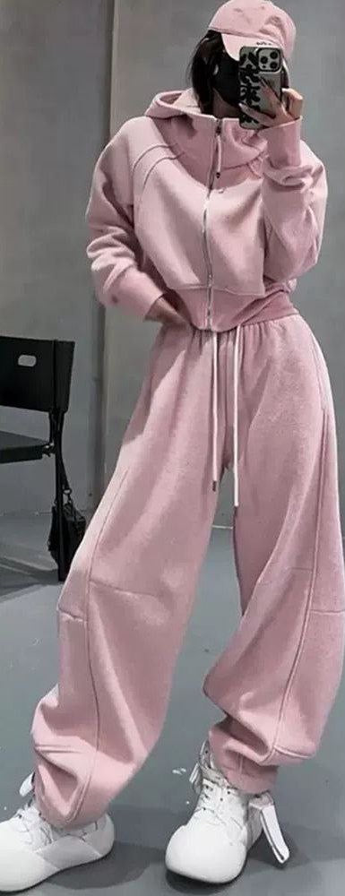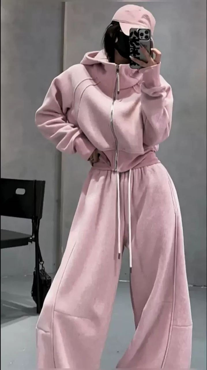 Comfortable and trendy spring/fall set featuring a cropped zip hoodie with high waist and wide-leg pants