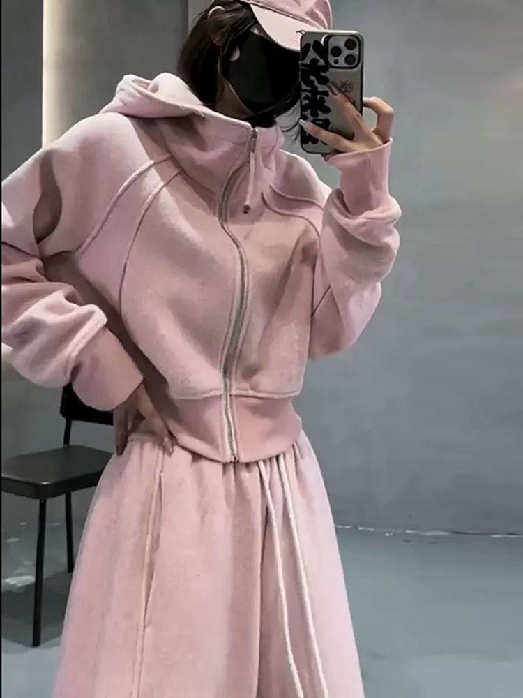 طقم مريح وعصري لربيع وخريف، يشمل سترة قصيرة بسحاب بخصر عالٍ مع قلنسوة، وبنطال واسع الساق