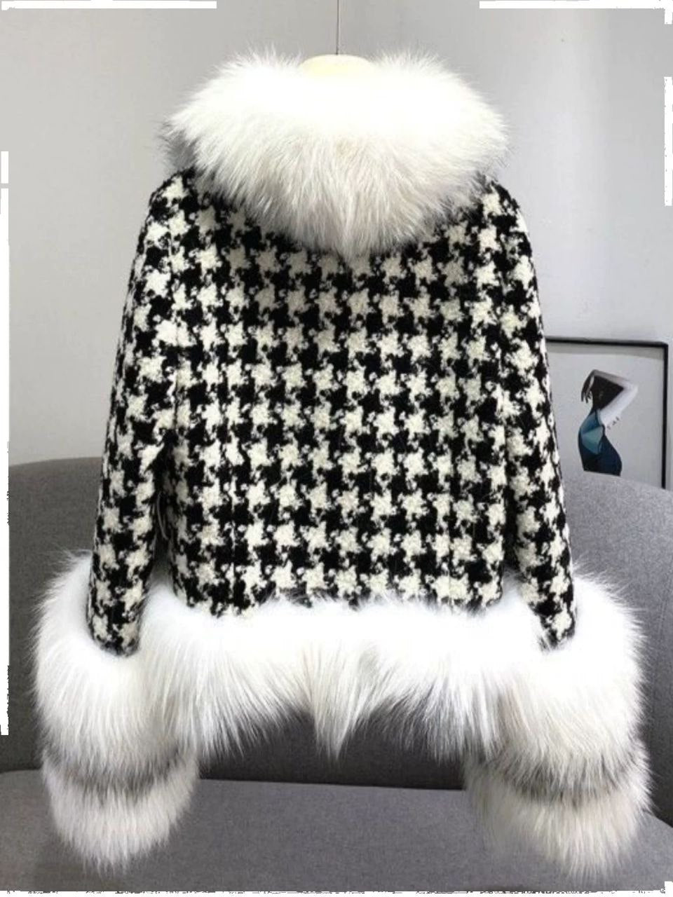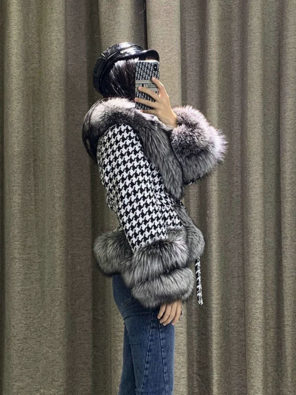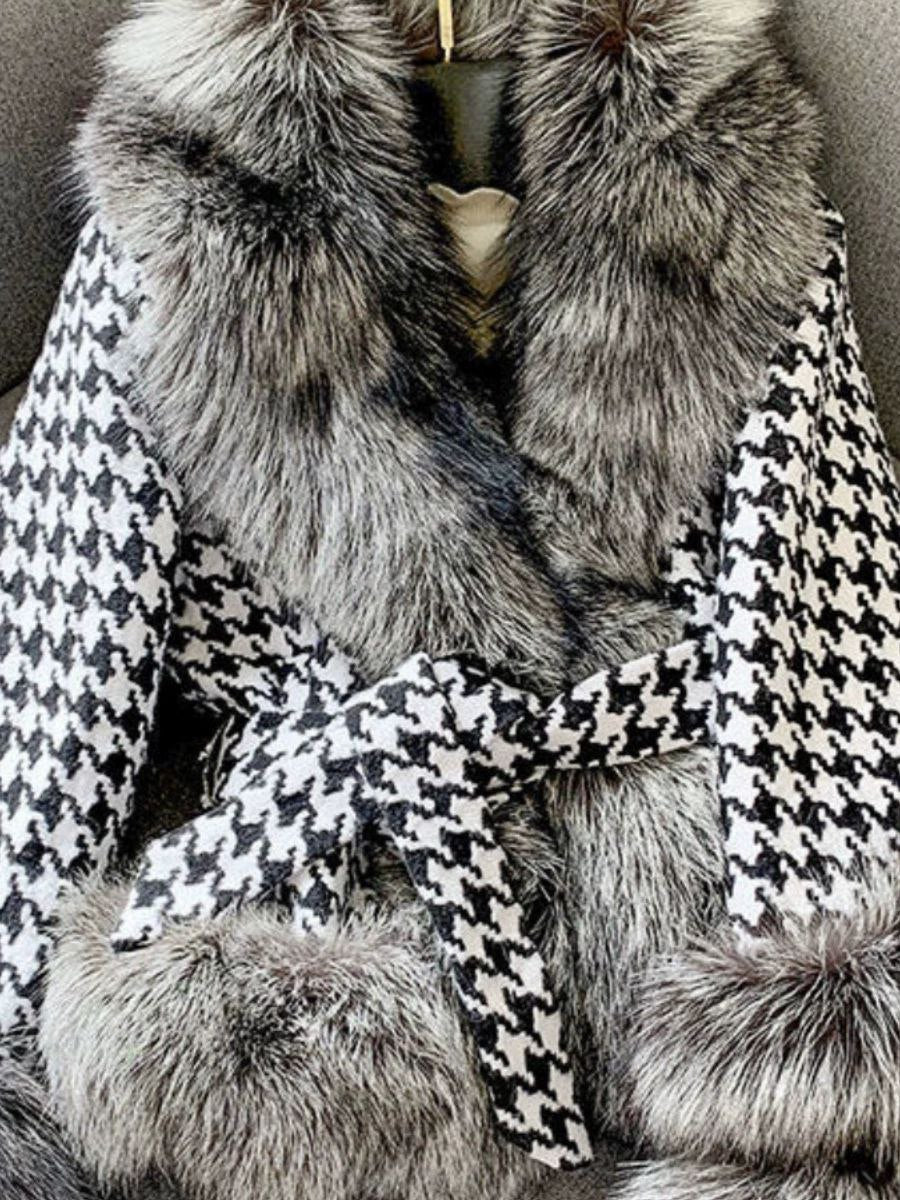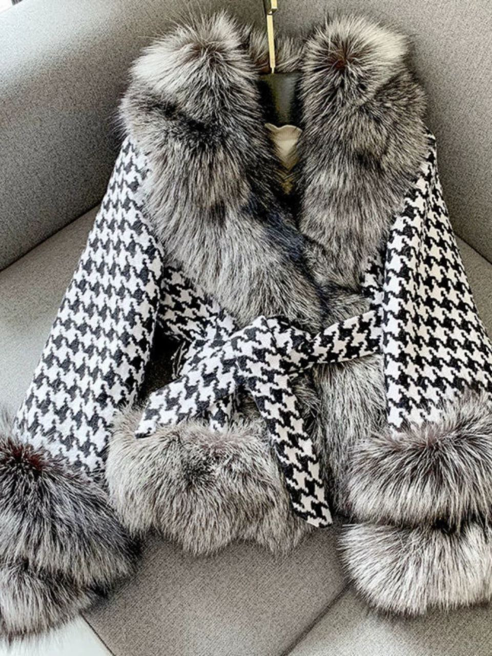 معطف فرو ثعلب كبير الحجم من الفرو الصناعي بنقشة مربعات كبيرة للخريف والشتاء، معطف فرو قصير للنساء.